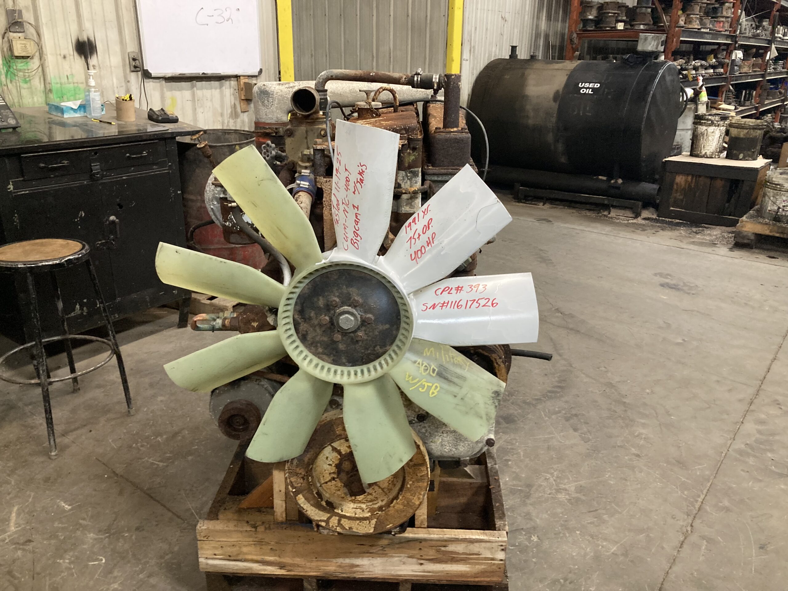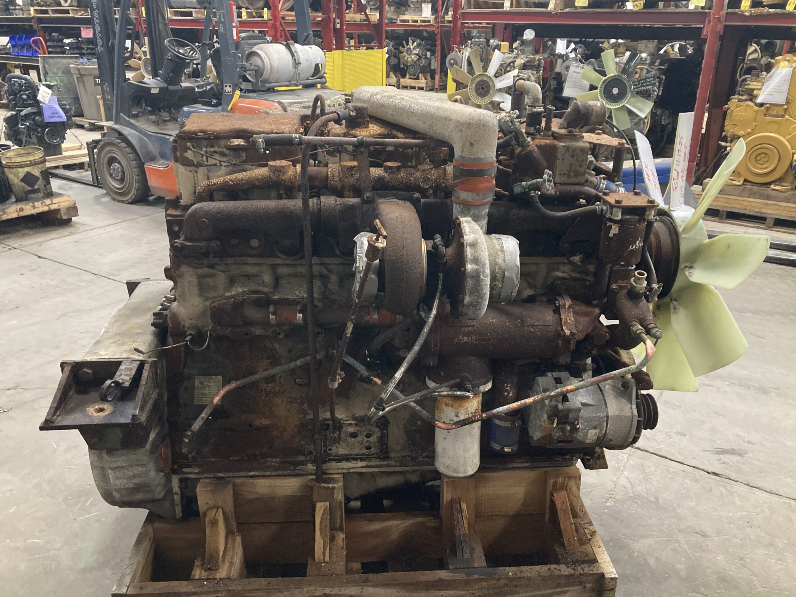 GOOD USED MILITARY TAKE OUT, 1991 CUMMINS NTC400 BIG CAM DIESEL ENGINE with JAKE BRAKES FOR SALE at ADELMAN’S TRUCK PARTS in CANTON, OHIO. COMPLETE and RUN TESTED, 855 CID, HIGH FLOW COOLING, with ENGINE BRAKE, 400 HP, CPL # 0393, with 75+ LBS OIL PRESSURE.