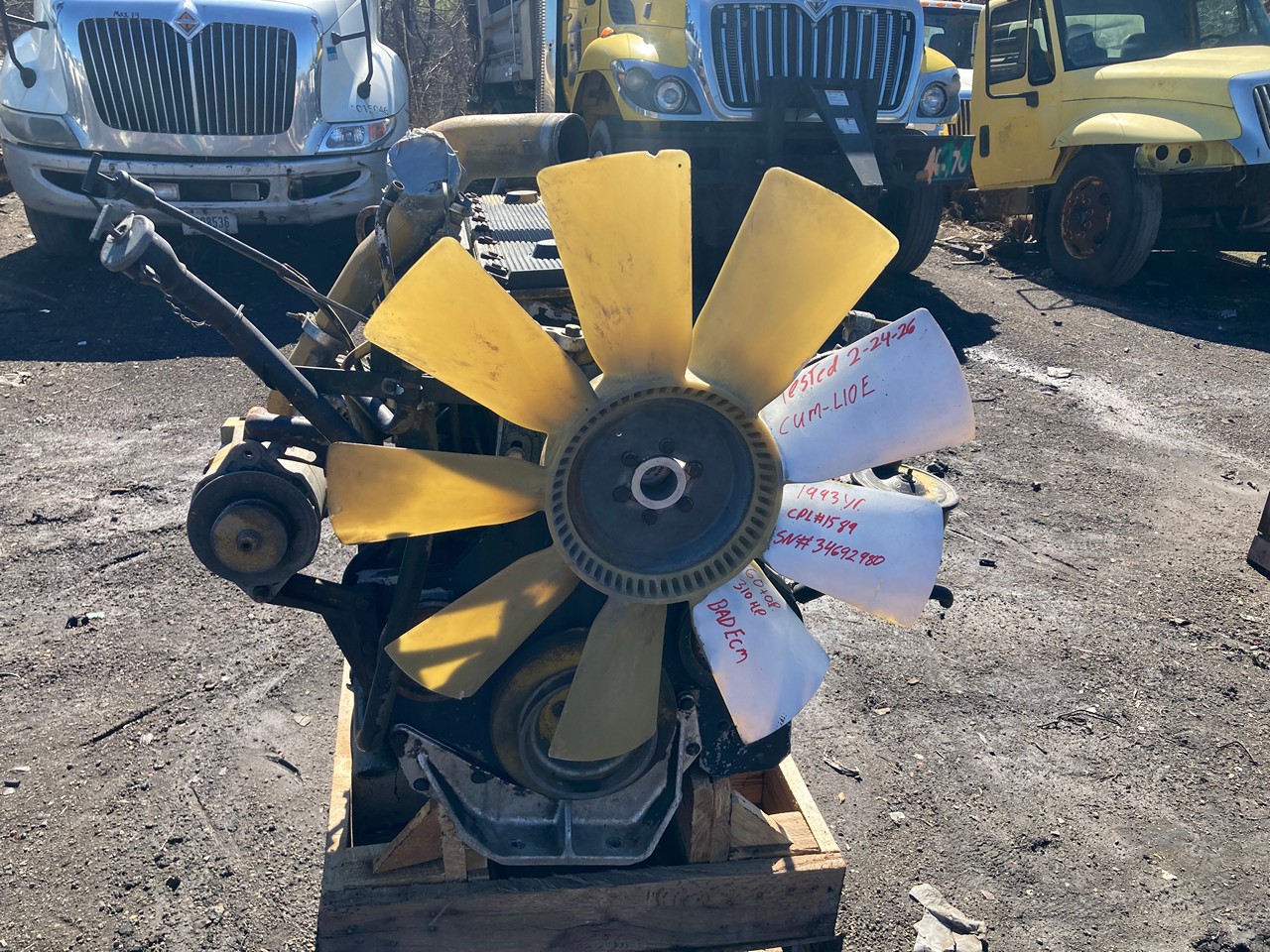 GOOD USED, 1993 CUMMINS L10E CELECT 310HP ELECTRONIC DIESEL TAKEOUT ENGINE FOR SALE at ADELMAN’S TRUCK PARTS in CANTON, OHIO. COMPLETE (HAS BAD ECM) and RUN TESTED, TURBOCHARGED and AIR TO AIR, HIGH FLOW COOLING with EXTERNAL DAMPER, CELECT FUEL SYSTEM, 310 HP @ 1600 RPM, with 1589 CPL # and 60+ LBS OIL PRESSURE.