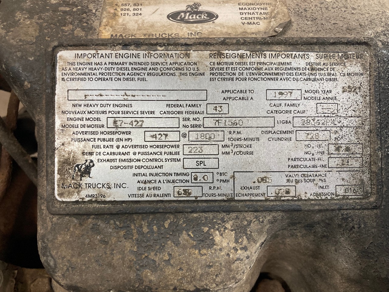 GOOD USED 1997 MACK E7-427 V-MAC II DIESEL TAKEOUT ENGINE FOR SALE at ADELMAN’S TRUCK PARTS in CANTON, OHIO. COMPLETE and RUN TESTED, 427 HP @ 1800 RPM, 28362P4 11GBA #, 4 VALVE HEAD, ENGINE BRAKES, MECHANICAL INJECTION PUMP with ELECTRONIC GOVERNOR, and 60+ LBS OIL PRESSURE.