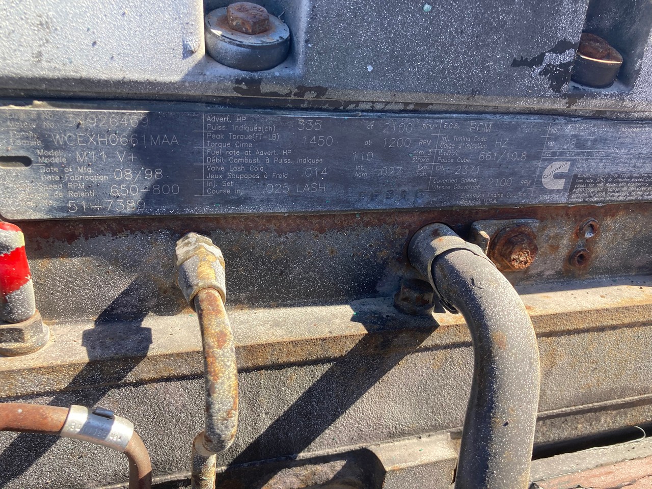 GOOD USED, 1998 CUMMINS M11+ 335HP DIESEL TAKEOUT ENGINE FOR SALE in CANTON, OHIO at ADELMAN’S TRUCK PARTS. RUN TESTED and COMPLETE, w/STARTER and ECM, CELECT PLUS, 2371 CPL #, 335 HP @ 2100 RPM, WCEXH0661MAA FAMILY #, and 50+ LBS OIL PRESSURE.