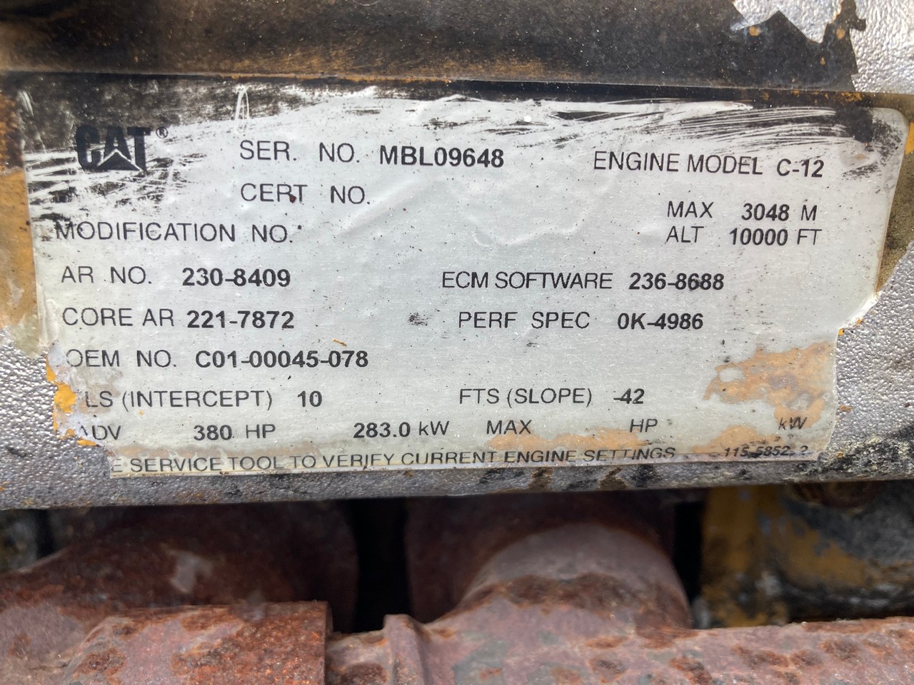2003 CATERPILLAR C12 410HP DIESEL TAKEOUT ENGINE with JAKES FOR SALE at ADELMAN’S TRUCK PARTS in CANTON, OHIO. 284,897 MILES SHOWING ON ECM, GOOD USED, COMPLETE and RUN TESTED, 70 PIN ECM, 380 HP @ 2100 RPM (ECM SET @ 410 HP), 230-8409 ARRANGEMENT #, ENGINE BRAKES, with 40+ LBS OIL PRESSURE.