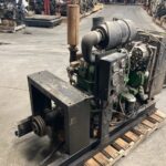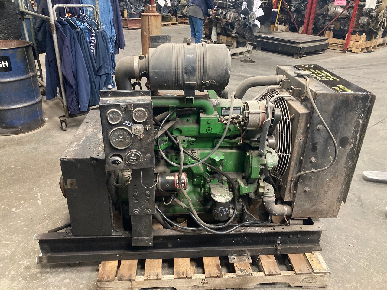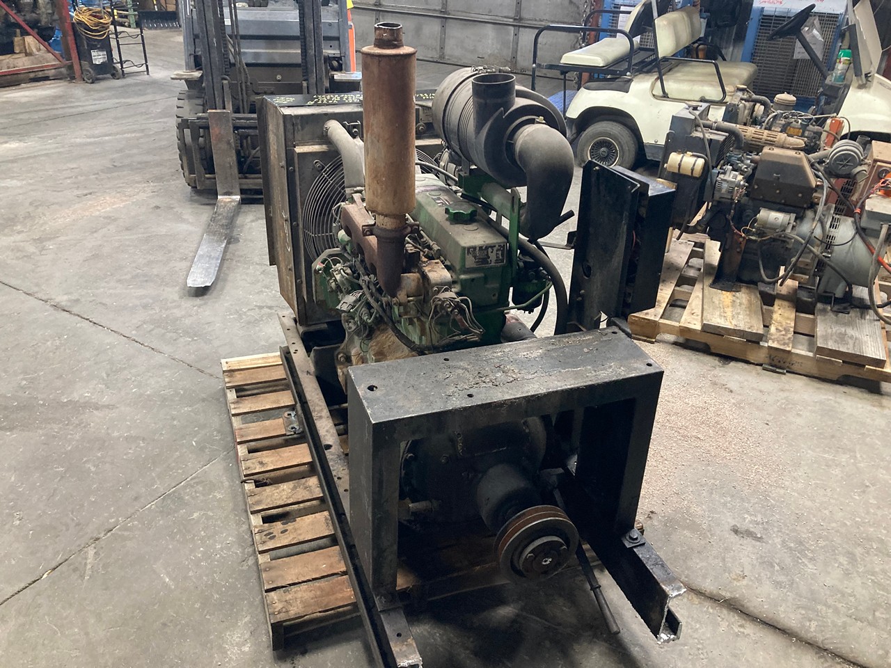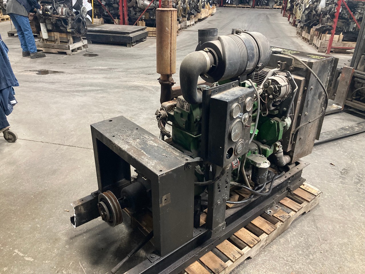 GOOD USED 2003 JOHN DEERE 4045 POWER TECH INDUSTRIAL POWER UNIT with HAND CLUTCH FOR SALE at ADELMAN’S in CANTON, OHIO. 900 HOURS SHOWING ON ECM, 4.5 LITERS, RUN TESTED and COMPLETE on a STEEL SKID with STARTER, ALTERNATOR, RADIATOR, MUFFLER, AIR CLEANER, and HAND CLUTCH with SHAFT and 2 SHEAVE PULLEY, TIER 1 EMISSIONS, 3JDXL06.8046 FAMILY #, with DDI EMISSIONS CONTROL SYSTEM. RATED 80 HP @ 2500 RPM, and 45+ LBS OIL PRESSURE.