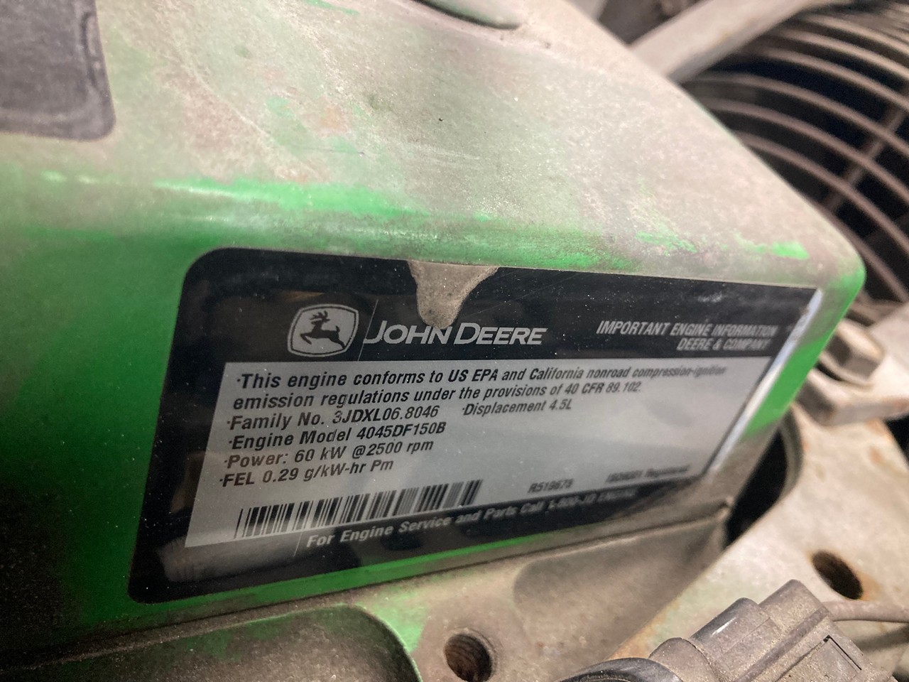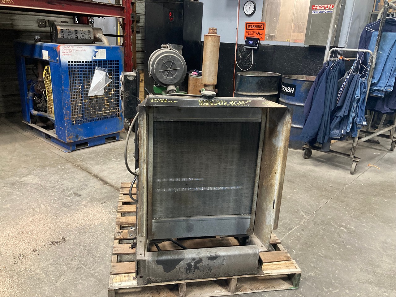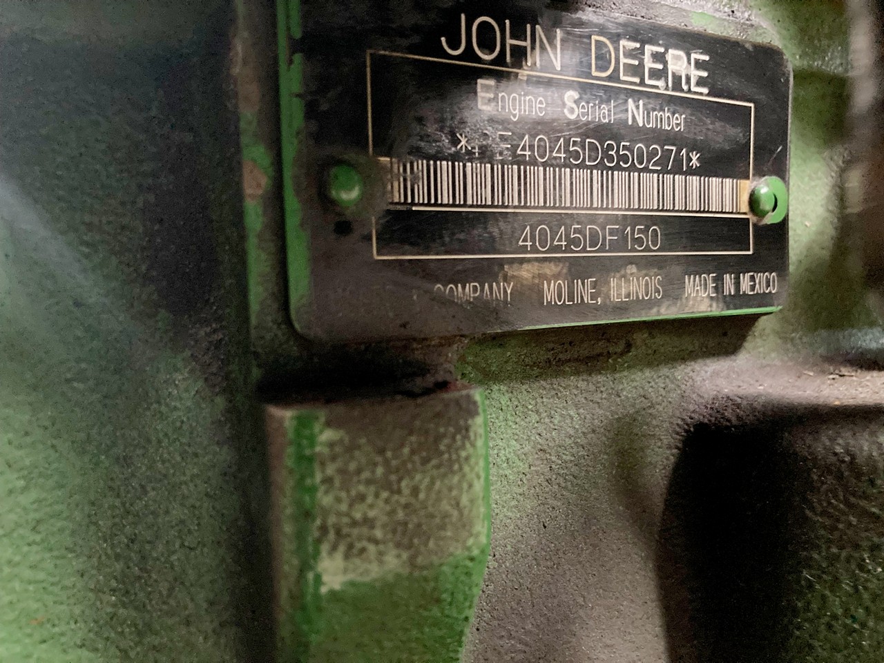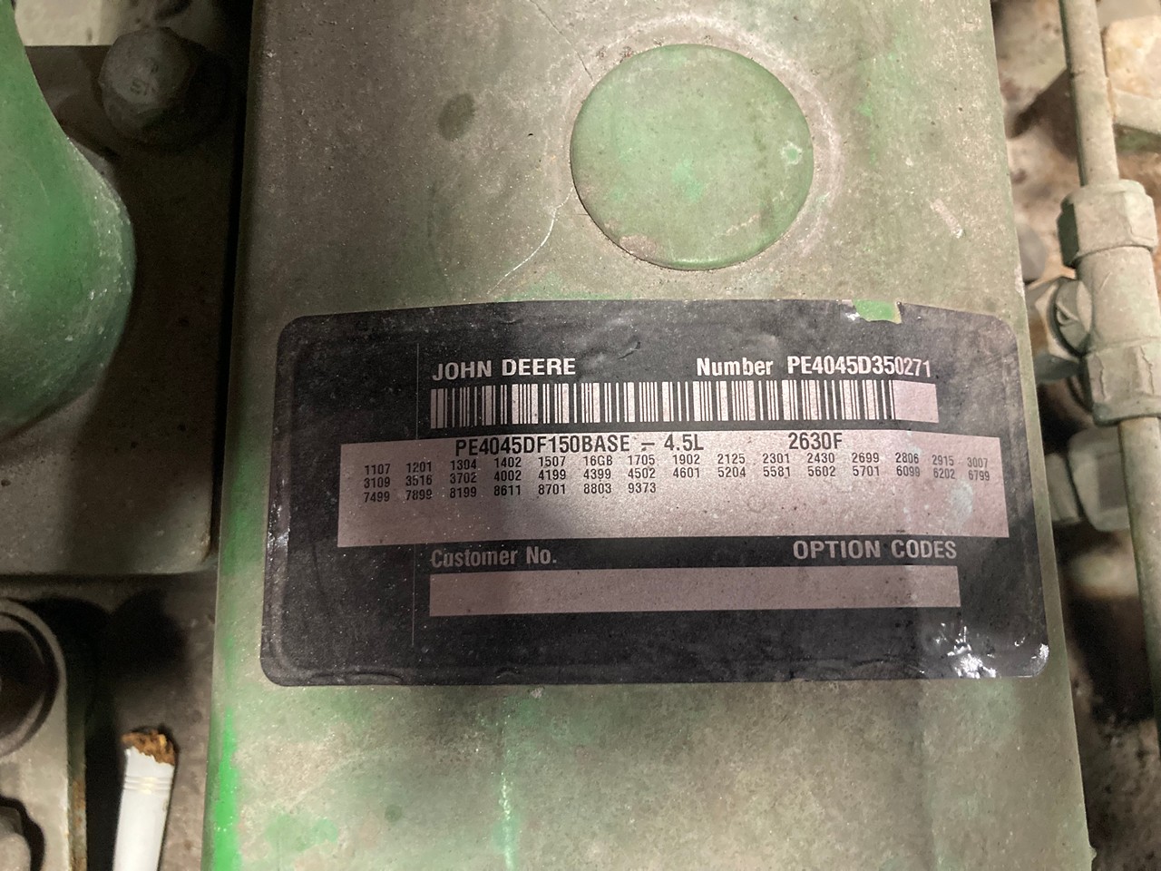 GOOD USED 2003 JOHN DEERE 4045 POWER TECH INDUSTRIAL POWER UNIT with HAND CLUTCH FOR SALE at ADELMAN’S in CANTON, OHIO. 900 HOURS SHOWING ON ECM, 4.5 LITERS, RUN TESTED and COMPLETE on a STEEL SKID with STARTER, ALTERNATOR, RADIATOR, MUFFLER, AIR CLEANER, and HAND CLUTCH with SHAFT and 2 SHEAVE PULLEY, TIER 1 EMISSIONS, 3JDXL06.8046 FAMILY #, with DDI EMISSIONS CONTROL SYSTEM. RATED 80 HP @ 2500 RPM, and 45+ LBS OIL PRESSURE.
