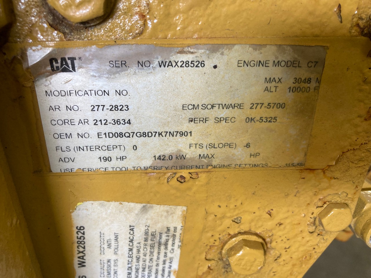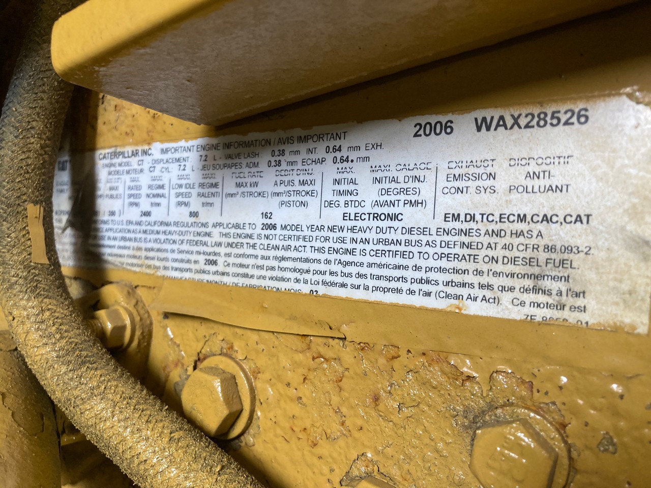 2006 CATERPILLAR C7 ACERT 190HP DIESEL TAKEOUT ENGINE FOR SALE at ADELMAN’S in CANTON, OHIO. 164,077 MILES SHOWING ON ECM, GOOD USED, RUN TESTED and COMPLETE with STARTER & ECM, 277-2823 ARRANGEMENT #, 190 HP @ 2300 RPM, with 45+ LBS OIL PRESSURE.