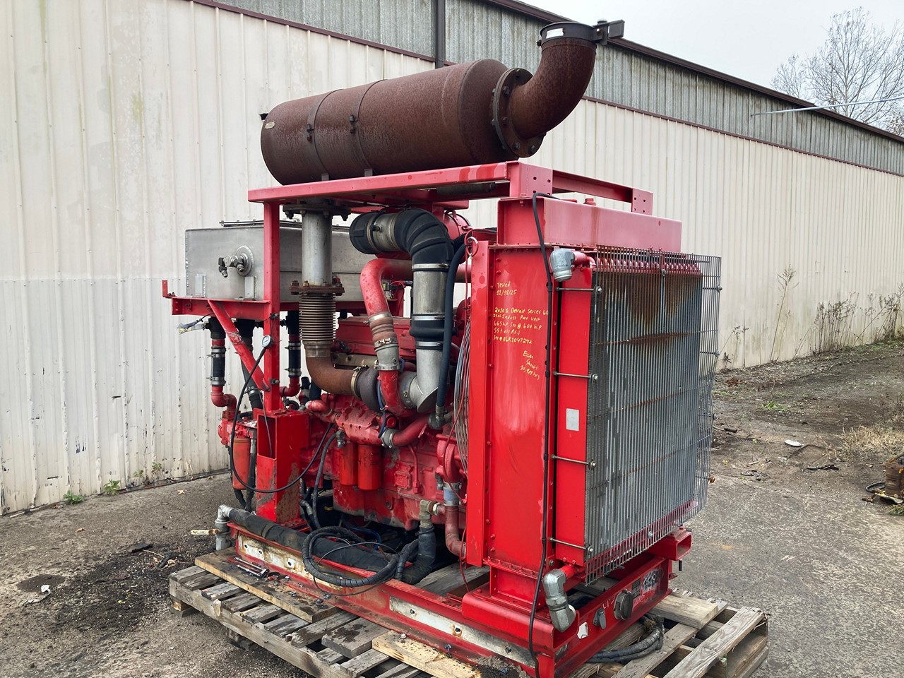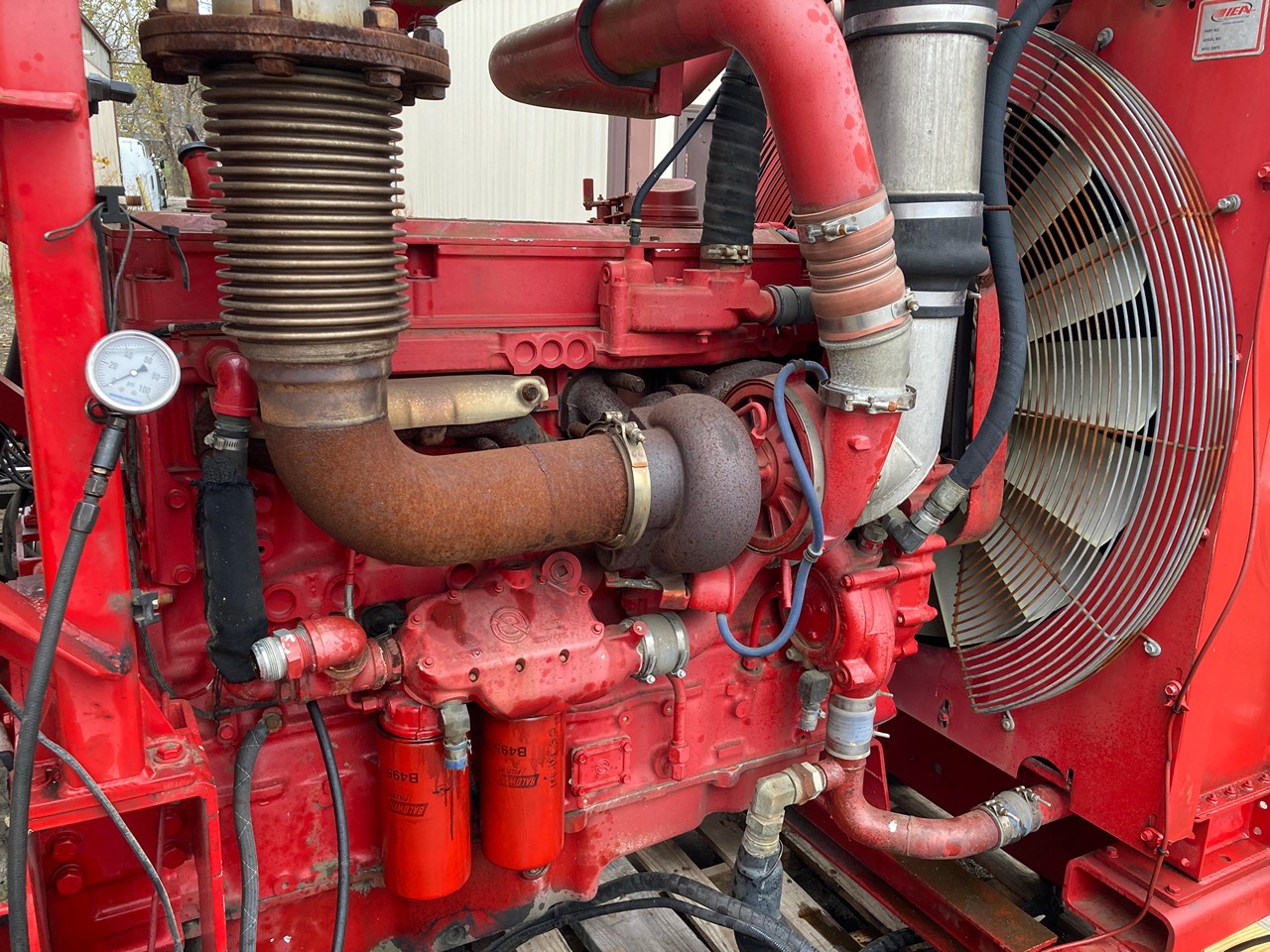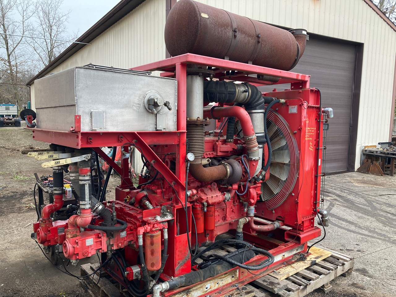 GOOD USED 2011 14.0L DETROIT DIESEL SERIES 60 HYDRAULIC POWER UNIT FOR SALE at ADELMAN’S in CANTON, OHIO. RUN TESTED and COMPLETE, with RADIATOR and CHARGE AIR COOLER, AIR CLEANER, MUFFLER, STARTER, ALTERNATOR, HYDRAULIC TANK, and PUMP DRIVE with HYDRAULIC PUMPS. 665 HP @ 2300 RPM (ECM SET @ 600 HP), DDEC 5, 6063HV39 MODEL #, TIER 3 EMISSIONS, ADDXL14.0VLD FAMILY #, with DDI, ECM, EGR, and TAA EMISSIONS CONTROL SYSTEMS, and 55+ LBS OIL PRESSURE.