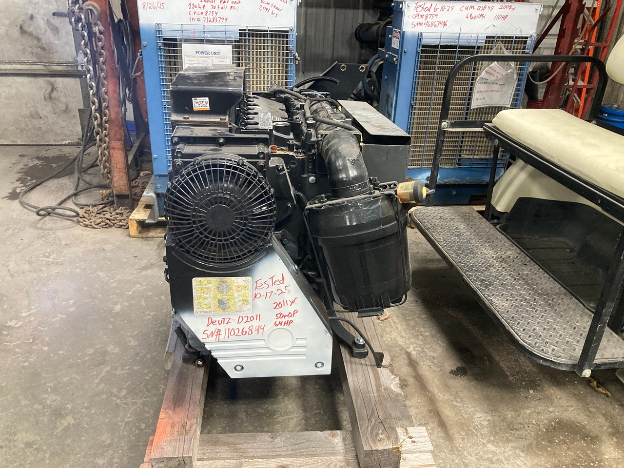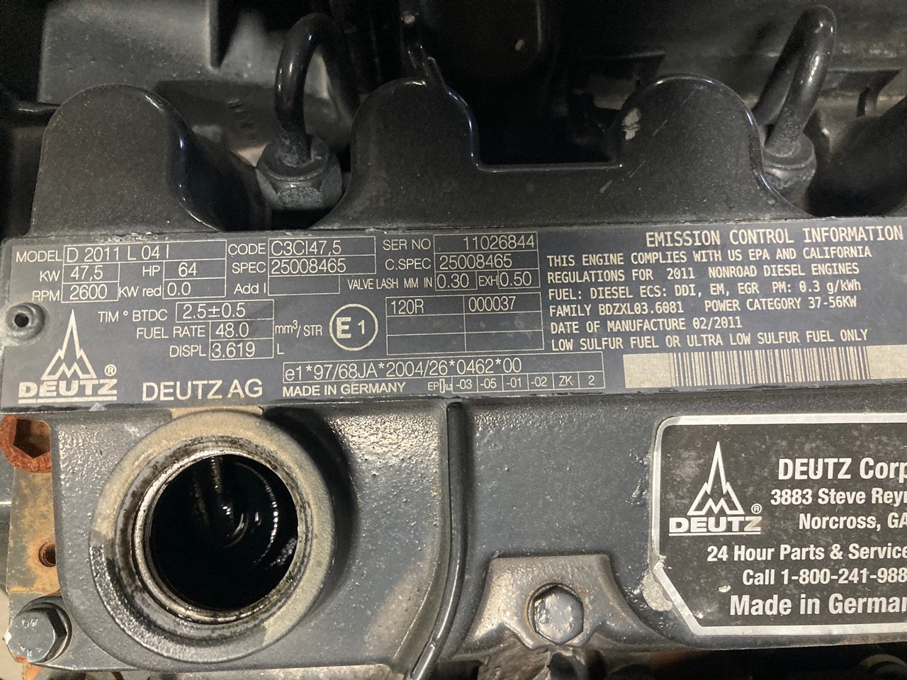 GOOD USED 2011 DEUTZ D2011L04i OIL COOLED DIESEL ENGINE with HAND CLUTCH FOR SALE at ADELMAN’S TRUCK PARTS in CANTON, OHIO. RUN TESTED and COMPLETE with STARTER, and PULL TYPE HAND CLUTCH with SHAFT, 64 HP @ 2600 RPM, 4 CYLINDER, NON TURBO, TIER 4 INTERIM EMISSIONS, OIL COOLED (INTEGRATED COOLER), with 50+ LBS OIL PRESSURE.