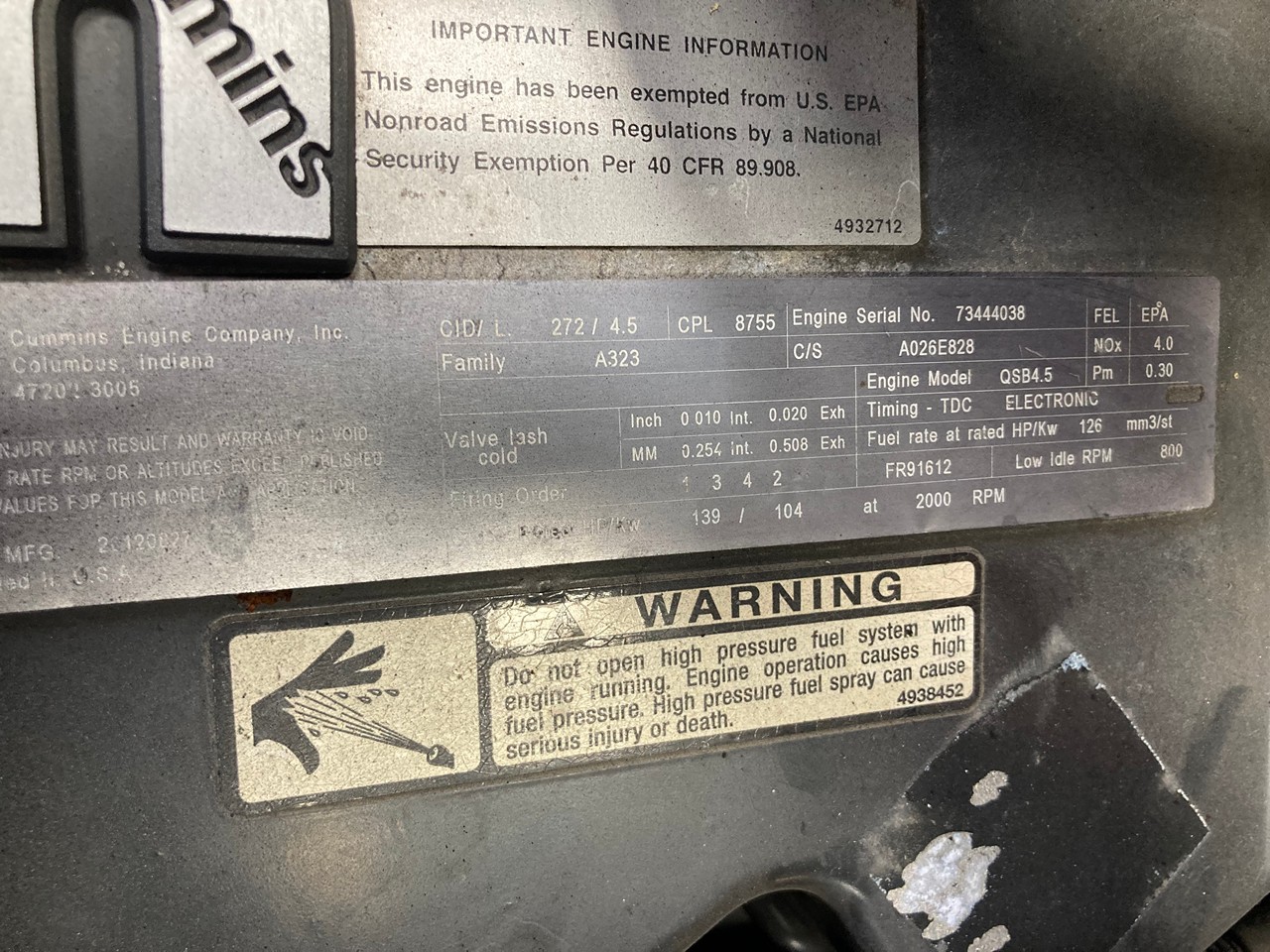 GOOD USED, 2012 CUMMINS QSB4.5 DIESEL TAKEOUT ENGINE FOR SALE at ADELMAN’S TRUCK PARTS in CANTON, OHIO. 1,877 HOURS SHOWING ON ECM, RUN TESTED and COMPLETE with ECM, FLYWHEEL, STARTER, and ALTERNATOR, 139 HP @ 2000 RPM, TIER 3 EMISSIONS, CPL # 8755, CM850 FUEL SYSTEM, and 70+ LBS OIL PRESSURE.