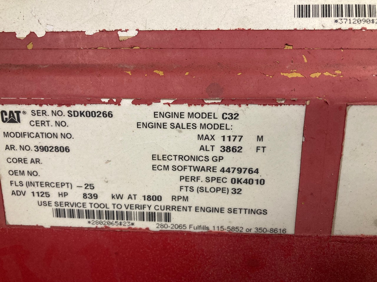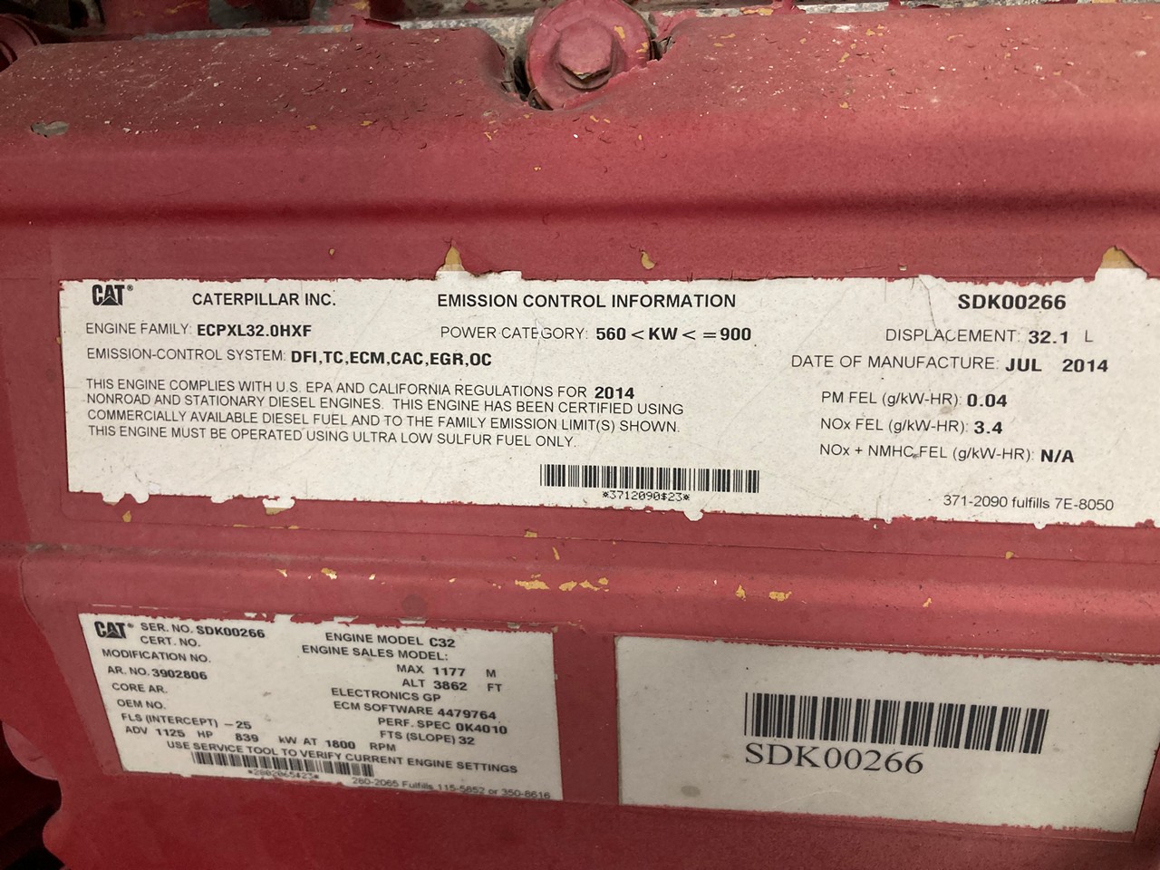 GOOD USED 2014 CATERPILLAR C32 ACERT 1,125HP INDUSTRIAL DIESEL TAKEOUT ENGINE FOR SALE at ADELMAN’S TRUCK PARTS in CANTON, OHIO. RUN TESTED, ELECTRONIC w/ECM, 390-2806 ARRANGEMENT #, 1,125 HP @ 1800 RPM, TIER 4 FINAL, ECPXL32.0HXF FAMILY #, with DDI, TC, ECM, CAC, EGR, and OC EMISSIONS CONTROL SYSTEMS, and 70+ LBS OIL PRESSURE. ***STARTER NOT INCLUDED