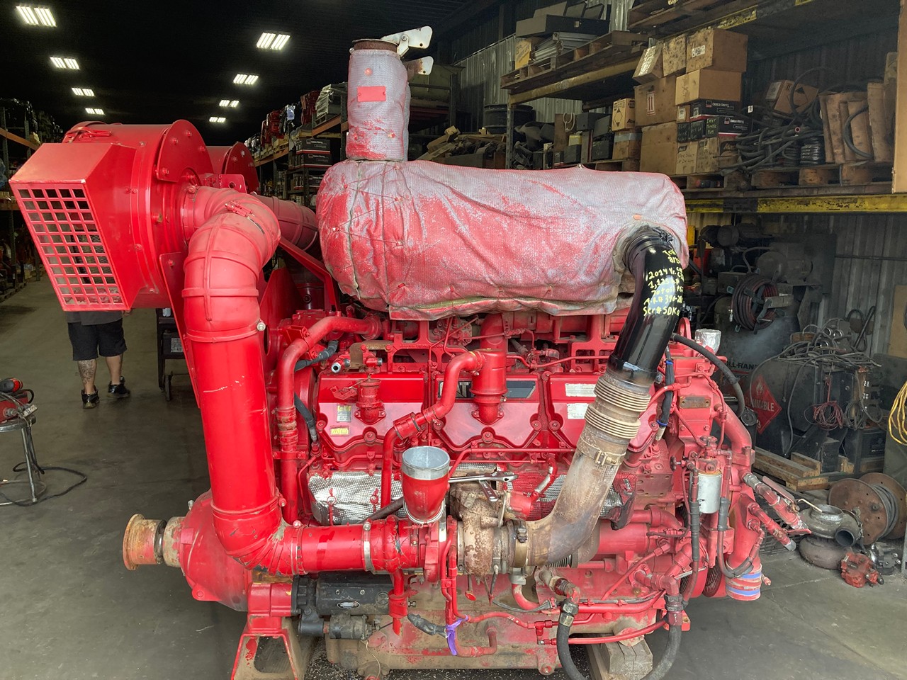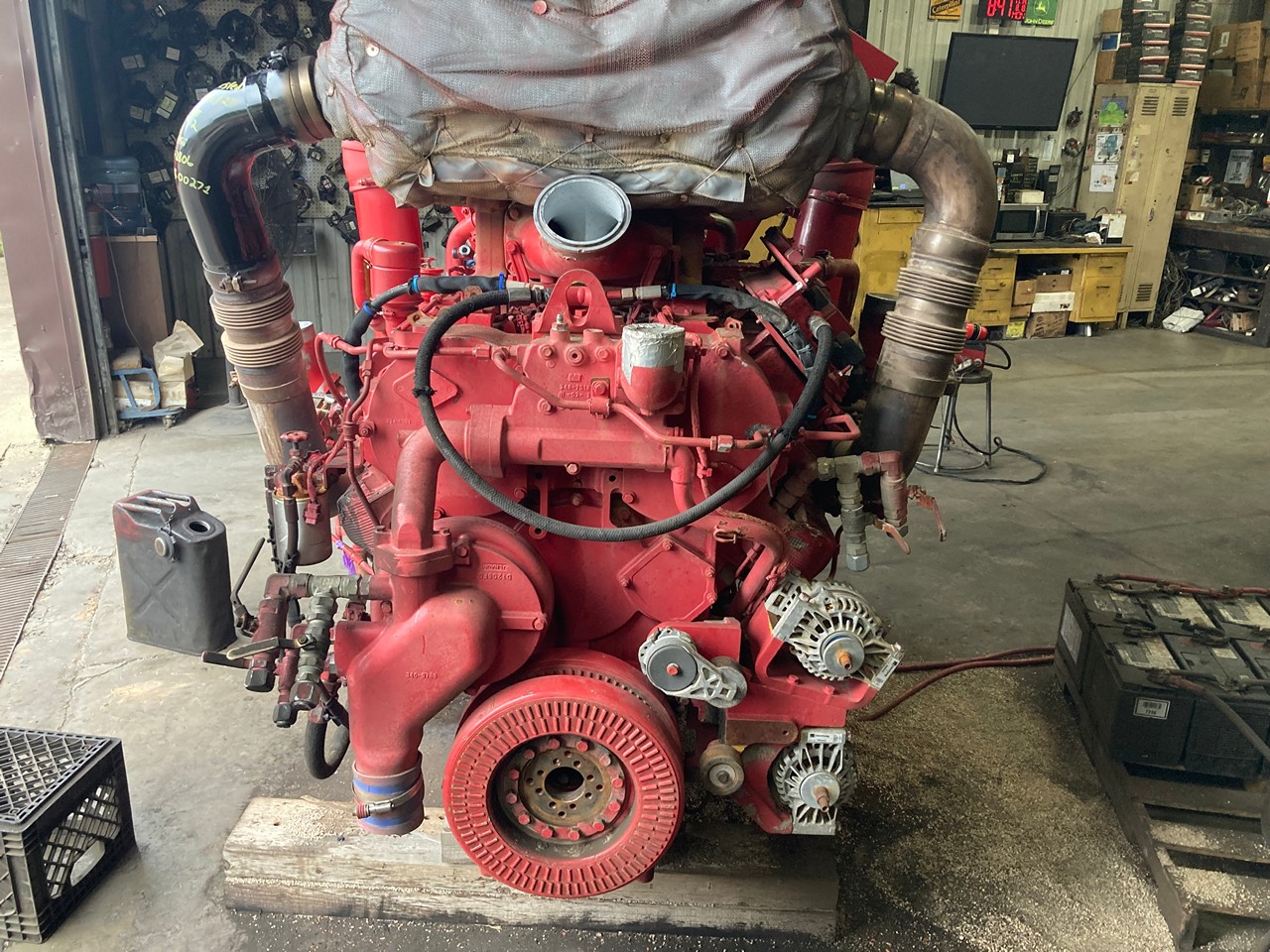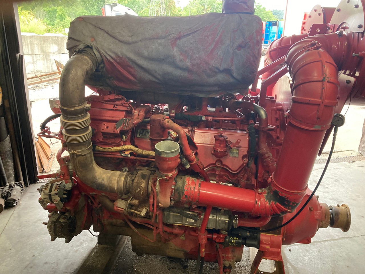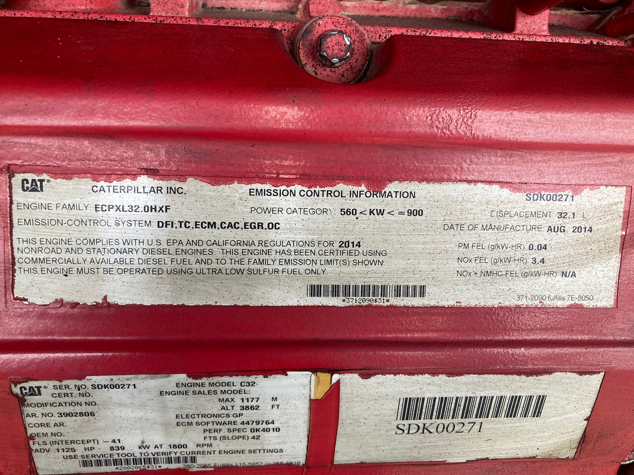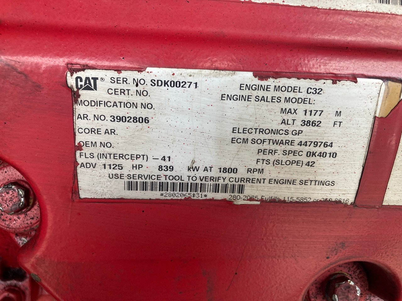 GOOD USED 2014 CATERPILLAR C32 ACERT 1125HP DIESEL TAKEOUT ENGINE with HAND CLUTCH FOR SALE at ADELMAN’S in CANTON, OHIO. RUN TESTED and COMPLETE, with STARTER, ALT., ECM, FLYWHEEL, &  4″ SHAFT with KEYWAY and COUPLER FLANGE,  390-2806 ARRANGEMENT #, 1125 HP @ 1800 RPM,  TIER 4 FINAL EMISSIONS, ECPXL32.0HXF FAMILY #, with DFI, TC, ECM, CAC, EGR, & OC EMISSIONS CONTROL SYSTEMS, and 70+ LBS OIL PRESSURE.