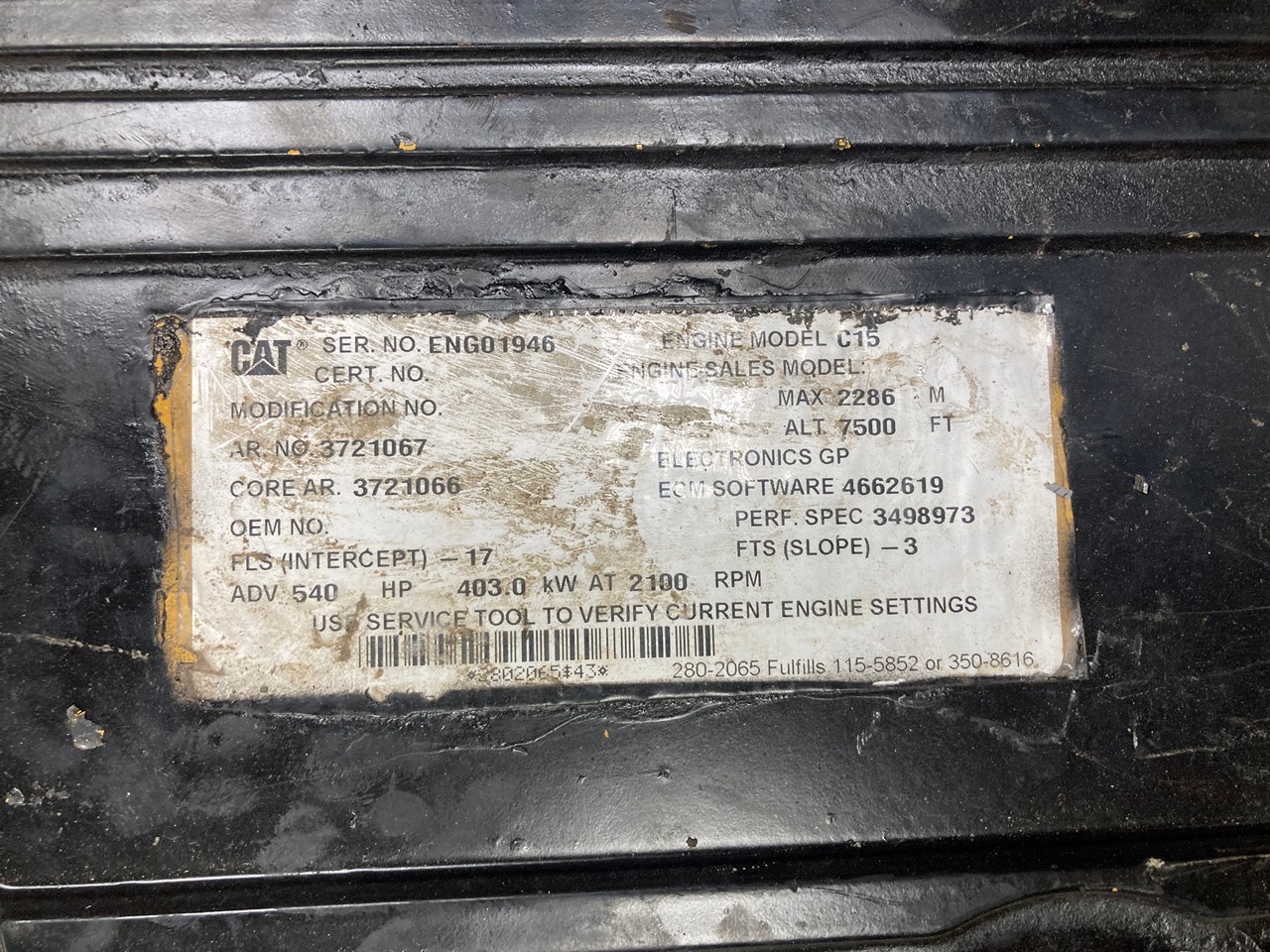 2016 CATERPILLAR C15 540HP INDUSTRIAL DIESEL TAKEOUT ENGINE FOR SALE at ADELMAN’S TRUCK PARTS in CANTON, OHIO. 3,037 HOURS SHOWING ON ECM, GOOD USED, RUN TESTED, ELECTRONIC w/70 PIN ECM, 15.2 LITERS, 540 HP @ 2100 RPM, TIER 4 FINAL, GCPXL15.2HTF FAMILY #, with DFI, TC, ECM, CAC, EGR, PTOX, OC, SCR-U, and AMOX EMISSIONS CONTROL SYSTEMS, ARRANGEMENT # 372-1067, and 75+ LBS OIL PRESSURE. PULLED FROM RM500B ROTARY MIXER ROAD RECLAIMER.