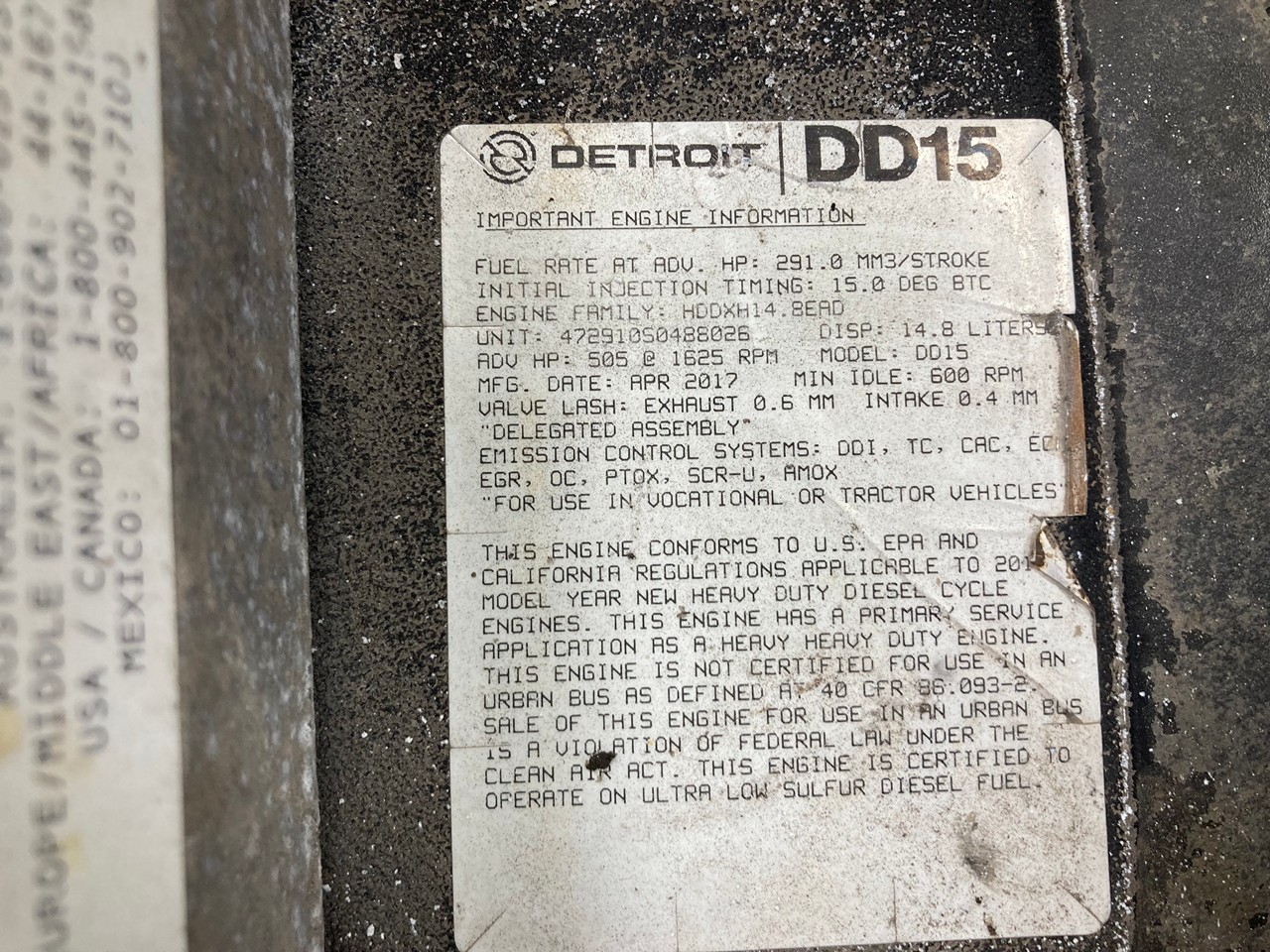 2017 DETROIT DD15 (AT) USED DIESEL TAKEOUT ENGINE FOR SALE at ADELMAN’S TRUCK PARTS in CANTON, OHIO. COMPLETE and RUN TESTED, 472910S, 455HP, ENGINE BRAKE, HDDXH14.8EAD FAMILY #, with DDI, TC, CAC, ECM, EGR, OC, PTOX, SCR-U, & AMOX EMISSIONS CONTROL SYSTEMS, and 60+ LBS OIL PRESSURE.