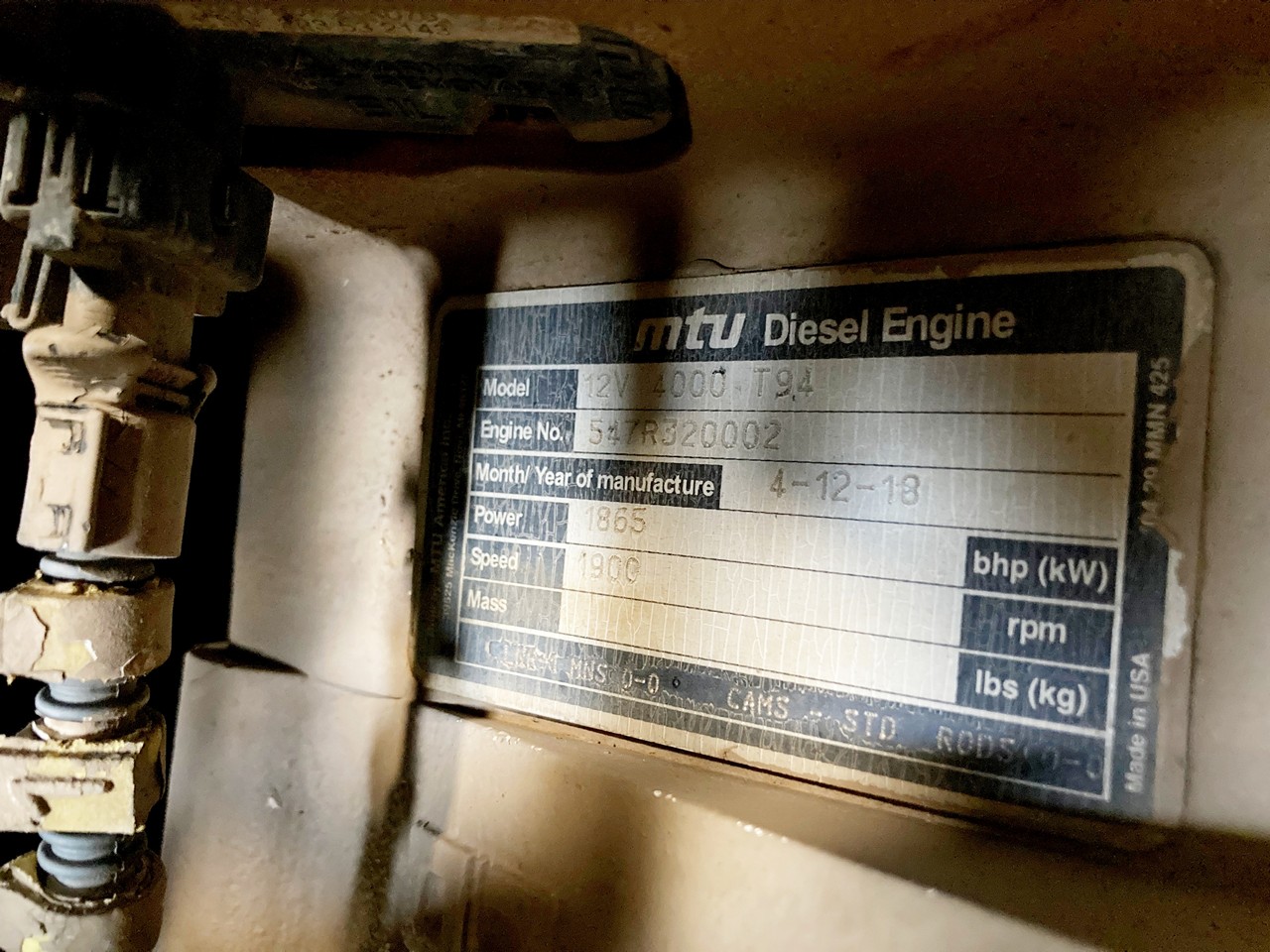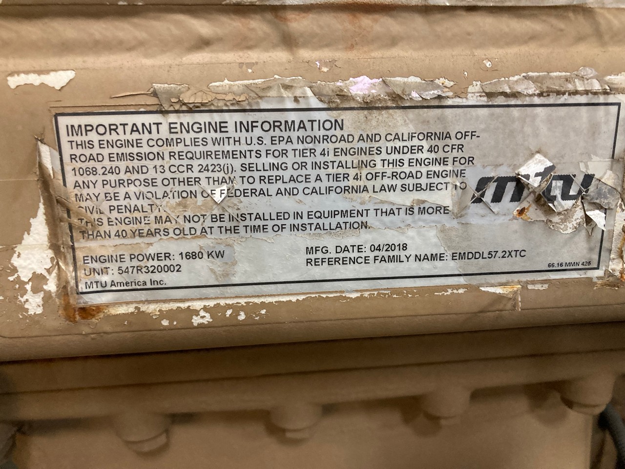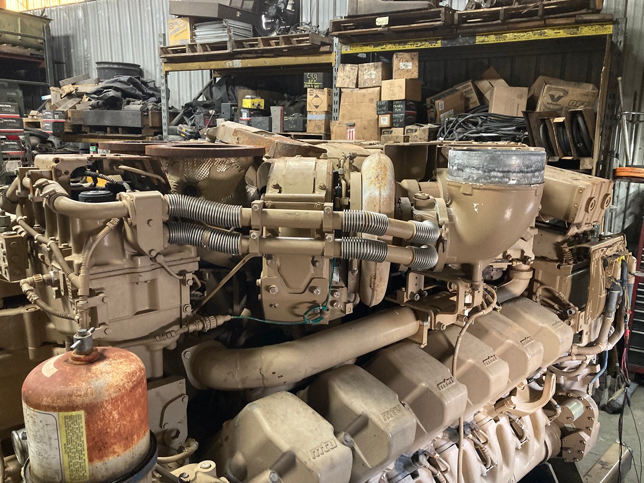 GOOD USED 2018 MTU 12V4000T94 DIESEL TAKEOUT ENGINE FOR SALE at ADELMAN’S TRUCK PARTS in CANTON, OHIO. RUN TESTED, 2252 HP @ 1900 RPM, TIER 4 INTERIM EMISSIONS, V-12, 57.2 LITERS, COMON RAIL, EMDDL57.2XTC FAMILY #, with DFI, TC, CAC, ECM, and EGR EMISSIONS CONTROL SYSTEMS, and SHOWING 100+ LBS OIL PRESSURE.