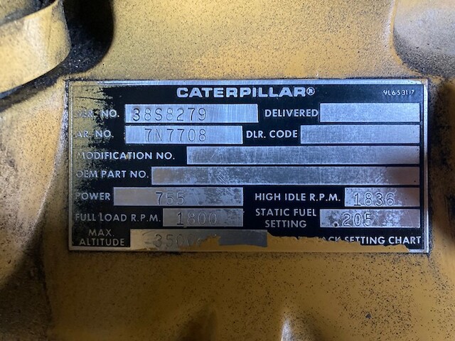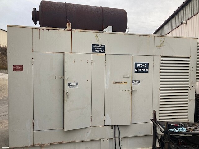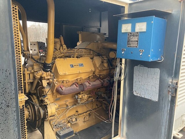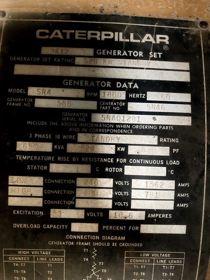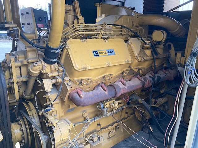 LOW HOUR (1,009 SHOWING ON METER), GOOD USED CATERPILLAR 3412–520KW DIESEL GENERATOR SET FOR SALE. COMPLETE AND RUN TESTED. V12 CYLINDER, TURBOCHARGED & WATER AFTERCOOLED. 3 PHASE, 60 CYCLE, 240/480 VOLTS, STAND-BY GENERATOR. 80+ LBS OIL PRESSURE. 30 DAY GUARANTEE ON THE BLOCK AND THE CRANK.