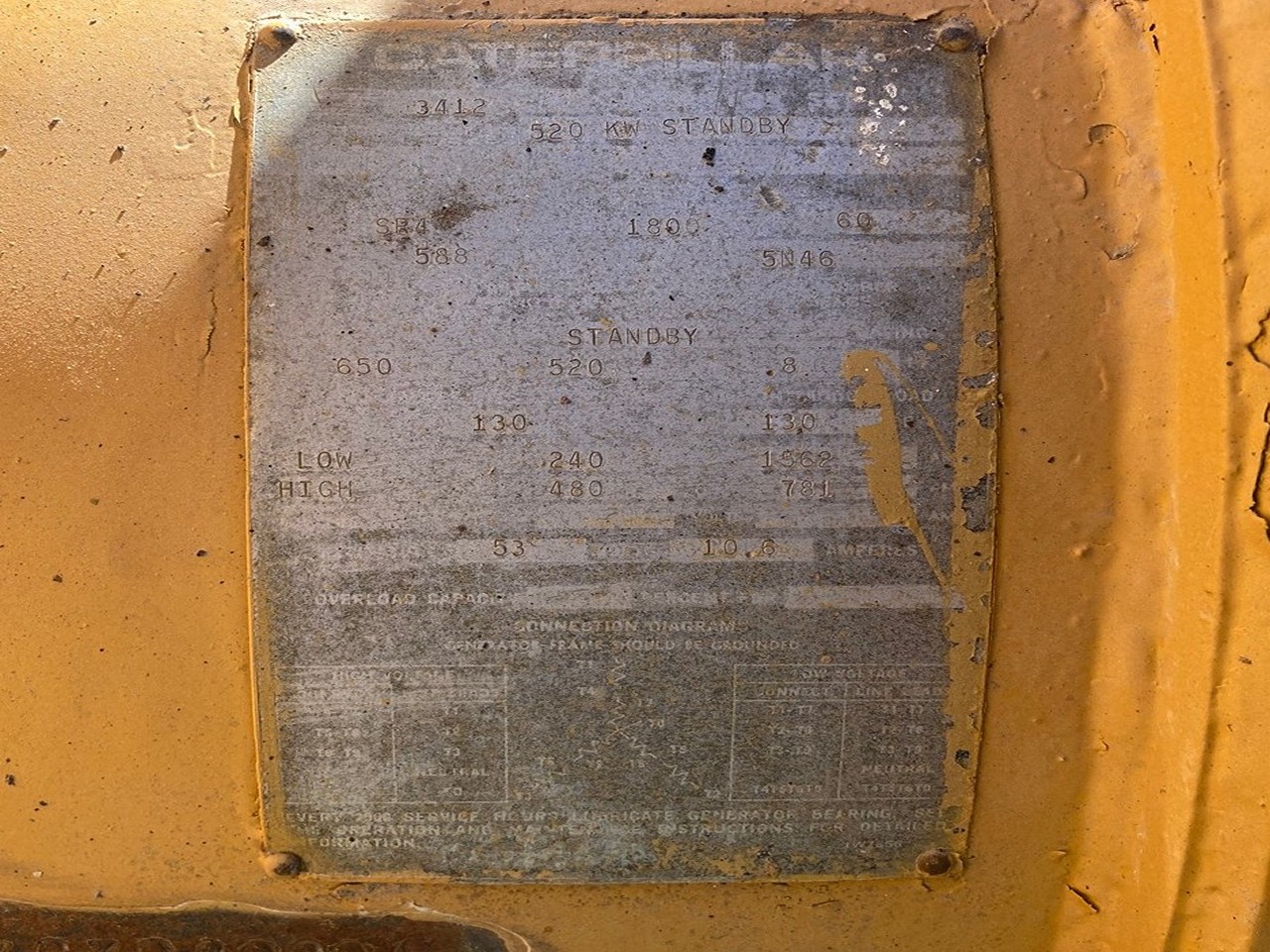 USED CATERPILLAR 3412 520KW DIESEL GENERATOR SET FOR SALE at ADELMAN’S TRUCK PARTS in CANTON, OHIO. V-12, PRE-COMBUSTION, TWIN TURBOCHARGED and WATER AFTERCOOLED, 7,258 HOURS SHOWING ON METER, GENERATOR MODEL SR4, 5N5078 GENERATOR ARRANGEMENT #, 240/480 VOLTS, 60 HZ, 650 KVA, 1800 RPM, STANDBY GENERATOR.