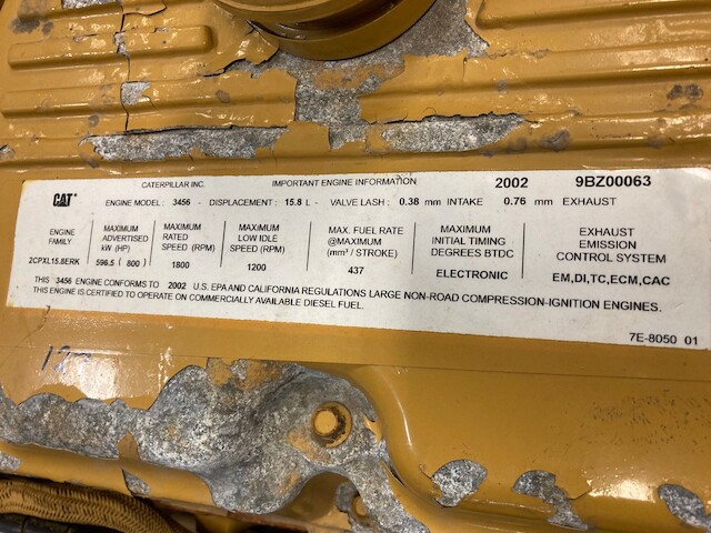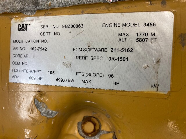 LOW HOURS (127 SHOWING ON ECM) 2005 CATERPILLAR 3456 (SERIAL # 98Z00063) TAKEOUT ENGINE IN STOCK AND FOR SALE AT ADELMAN’S TRUCK PARTS IN CANTON, OHIO. RUN TESTED AND COMPLETE (MINUS ALTERNATOR), WITH STARTER, TURBO, 40 PIN ECM, FLYWHEEL & HOUSING. 669 HP @ 1800 RPM. 162-7542 ARRANGEMENT #. 80+ LBS OIL PRESSURE. 30 DAY GUARANTEE ON THE BLOCK AD THE CRANK. NO CORE EXCHANGE NEEDED!