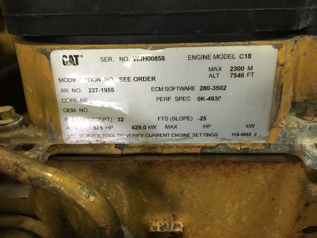 GOOD USED CATERPILLAR C18 INDUSTRIAL TAKEOUT ENGINE FOR SALE. ALL COMPLETE AND RUN TESTED. ELECTRONIC WITH 70 PIN ECM. TURBOCHARGED, 6 CYLINDER. EM, DI, TC, ECM, & CAC EMISSION CONTROL SYSTEMS. 65 LBS OIL PRESSURE. 30 DAY GUARANTEE ON THE BLOCK AND THE CRANK. NO CORE EXCHANGE NEEDED!