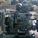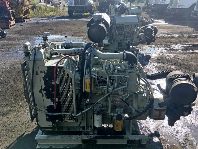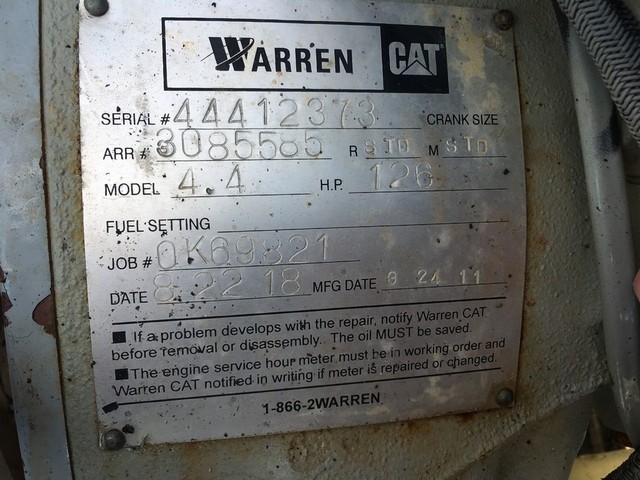 GOOD USED CATERPILLAR C4.4 INDUSTRIAL HYDRAULIC POWER UNIT FOR SALE. ELECTRONIC, 4 CYLINDER, TURBOCHARGED AND AIR TO AIR. RUN TESTED AND COMPLETE ON SKID WITH RADIATOR & CHARGE AIR COOLER, STARTER, ALT., MUFFLER, AIR CLEANER, CONTROL BOX, AND ‘FUNK’ GEARBOX WITH 2 ‘OILGEAR’ HYDRAULIC PUMPS. 65-75 LBS OIL PRESSURE. 30 DAY GUARANTEE ON THE BLOCK AND THE CRANK.