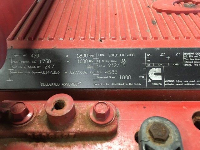GOOD USED 2015 CUMMINS ISX15 TAKEOUT ENGINE FOR SALE. ALL COMPLETE AND RUN TESTED. ELECTRONIC WITH EGR, PTOX (DPF), AND SCRC (DEF) EMISSIONS CONTROL SYSTEMS. WITH ENGINE BRAKE. 40 LBS OIL PRESSURE. 30 DAY GUARANTEE ON THE BLOCK AND THE CRANK. NO CORE EXCHANGE NEEDED!