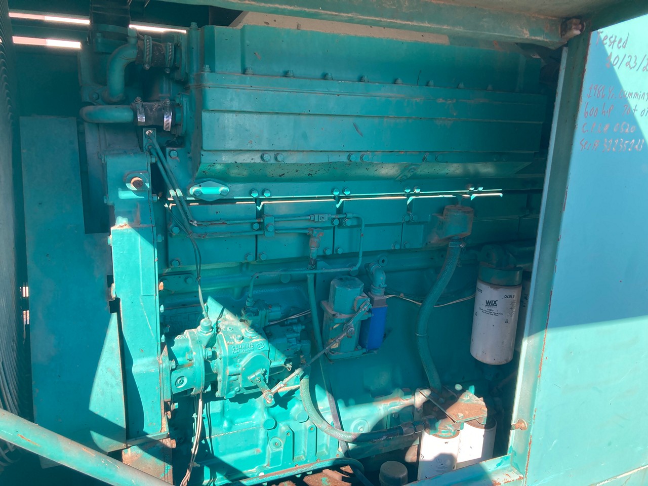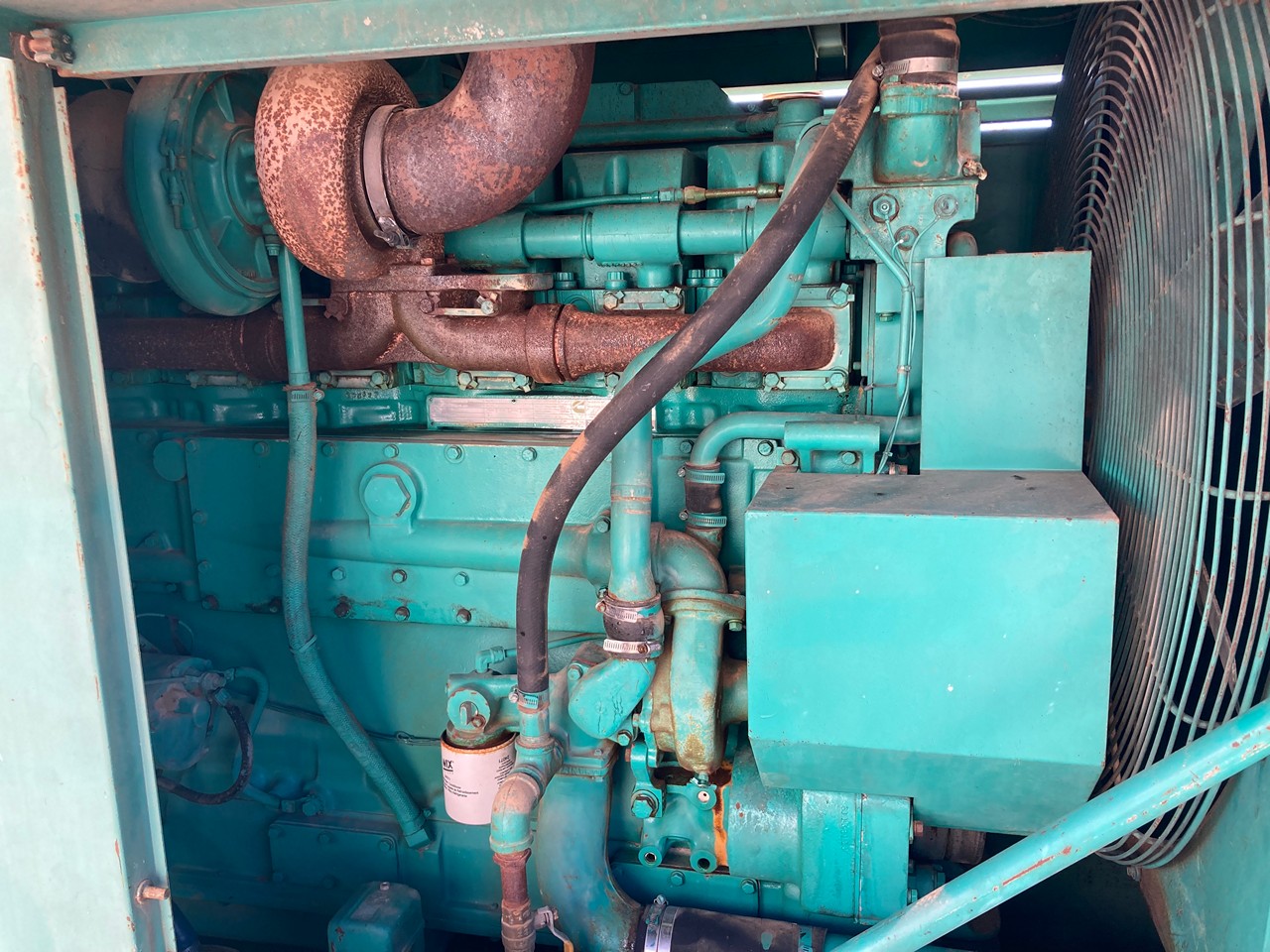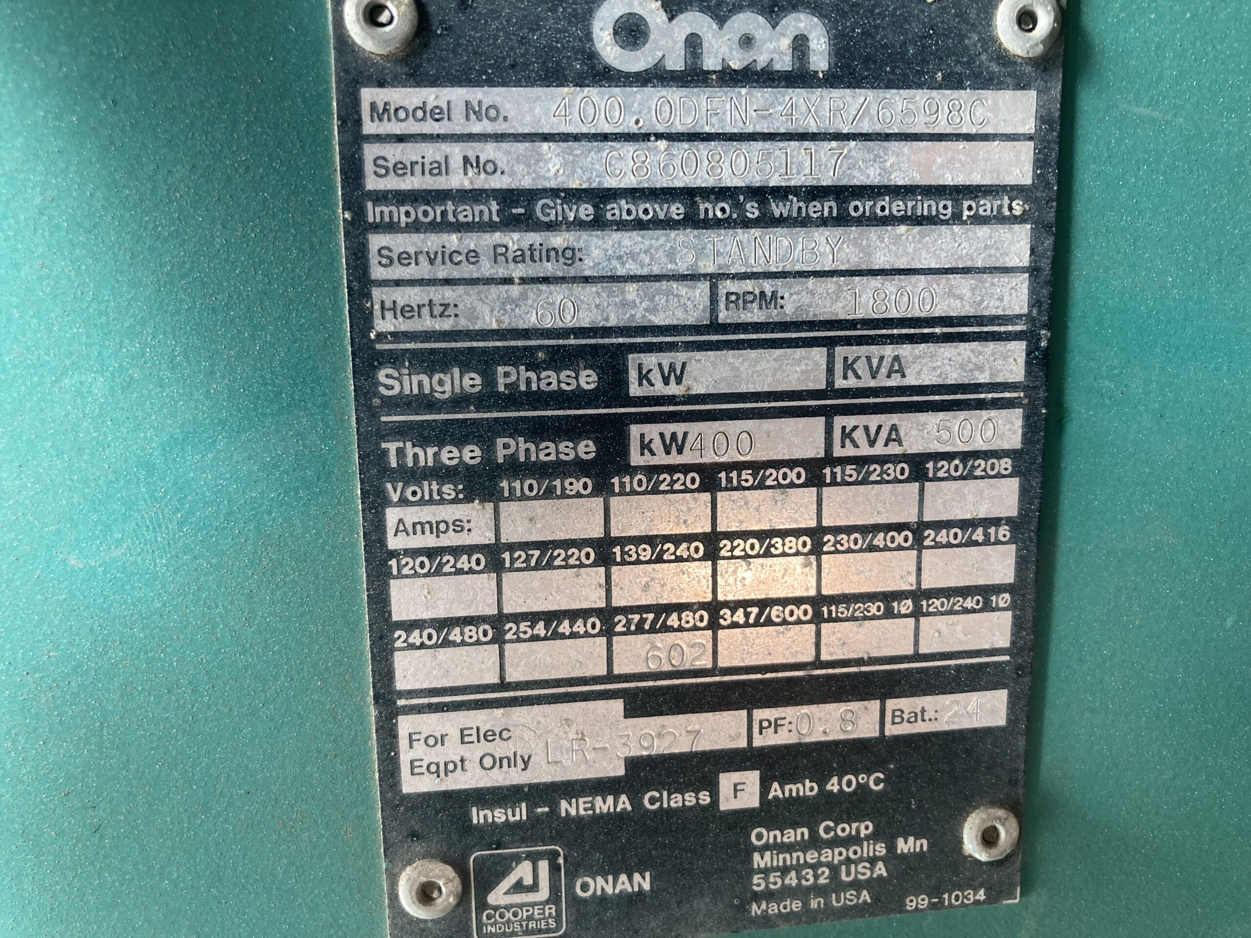 1986 CUMMINS KTA19-G2 400KW DIESEL GENERATOR SET FOR SALE at ADELMAN’S TRUCK PARTS in CANTON, OHIO. 1,252 HOURS SHOWING ON METER, 0520 CPL #, ONAN GENERATOR, 3 PHASE, 400 KW, 500 KVA, 277/480 VOLTS, 602 AMPS, 60 HZ, 600 HP @ 1800 RPM, STANDBY UNIT, with 70+ LBS OIL PRESSURE.