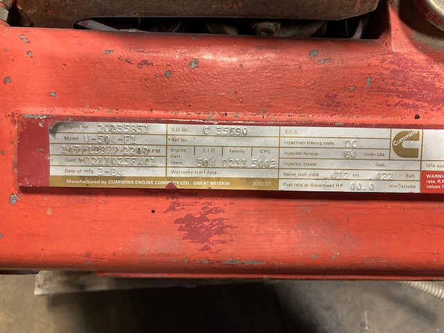 LOW HOUR (748 SHOWING ON METER) GOOD USED CUMMINS V504-F1 TAKEOUT ENGINE FOR SALE. ALL COMPLETE AND RUN TESTED. V8, NON TURBO, CPL# 5003. 80+ LBS OIL PRESSURE. 30 DAY GUARANTEE ON THE BLOCK AND THE CRANK. NO CORE EXCHANGE NEEDED!