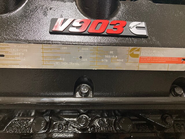 FACTORY REMANUFACTURED CUMMINS V903 DIESEL ENGINE FOR SALE AT ADELMAN’S IN OHIO. V8, NON TURBO, 295 HP, 2012 yr., 2170 CPL #. NO CORE EXCHANGE REQUIRED!