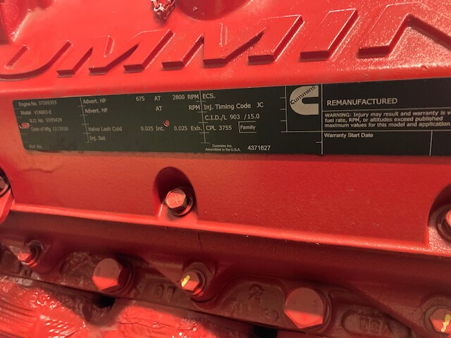 UNUSED, GOVT REMANUFACTURED CUMMINS VTA903E ELECTRONIC DIESEL ENGINE FOR SALE. COMPLETE WITH STARTER AND ECM. 675 HP, 2016 REMAN DATE, CPL # 3755. LIKE NEW!!