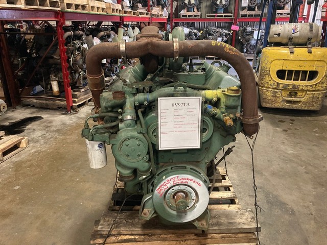 GOOD USED 8V92TA MILITARY TAKEOUT ENGINE FOR SALE. ALL COMPLETE (MINUS FLYWHEEL) AND RUN TESTED. V8, TURBOCHARGED AND WATER AFTERCOOLED WITH JAKE BRAKES. 30 LBS OIL PRESSURE. 30 DAY GUARANTEE ON THE BLOCK AND THE CRANK. NO CORE EXCHANGE NEEDED!