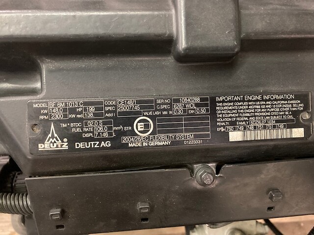 2005 UNUSED GOVT SURPLUS DEUTZ BF6M1013C WATER COOLED, ELECTRONIC DIESEL ENGINE FOR SALE. COMES COMPLETE WITH RADIATOR, CHARGE AIR COOLER, ECM, & ALTERNATOR (MINUS STARTER). DIRECT INJECTION, 199 HP, TIER 2 EMISSIONS, 5DZXL07.1034 FAMILY #. NO CORE EXCHANGE NEEDED!