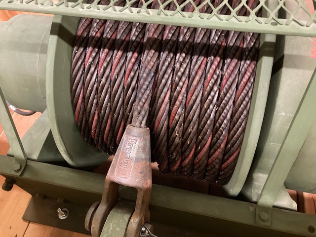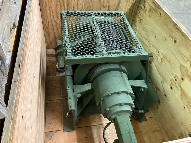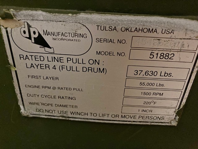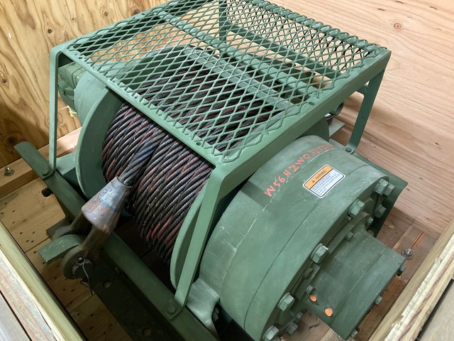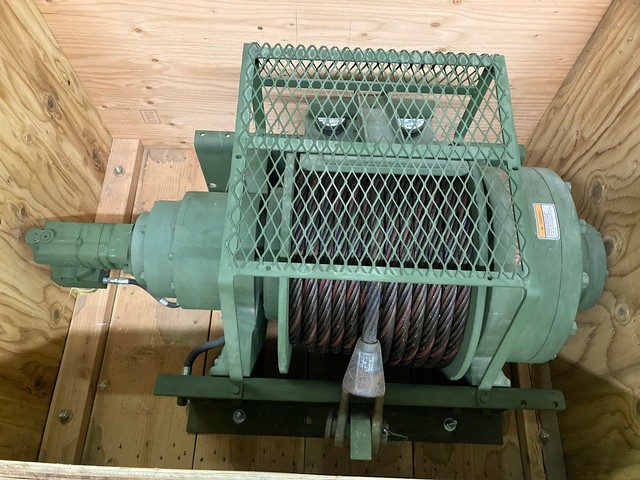 55,000 LB. DP MANUFACTURING UNUSED GOVT SURPLUS WINCH FOR SALE. 55K CAPACITY, WITH HYDRAULIC MOTOR AND 1″ CABLE WITH LARGE EYELET.