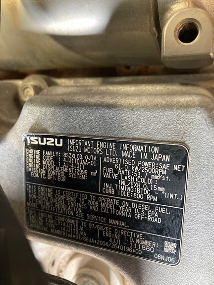GOOD USED 2008 ISUZU 4JJ1T HYDRAULIC POWER UNIT FOR SALE. RUN TESTED & COMPLETE (MINUS CONTROL BOX) WITH RADIATOR, STARTER, ALT., AND HYDRAULIC PUMP. 4 CYLINDER, TURBOCHARGED, WITH ECM, TC, DFI, & EGR EMISSIONS CONTROL SYSTEMS. 65+ LBS OIL PRESSURE. 30 DAY GUARANTEE ON THE BLOCK AND THE CRANK.