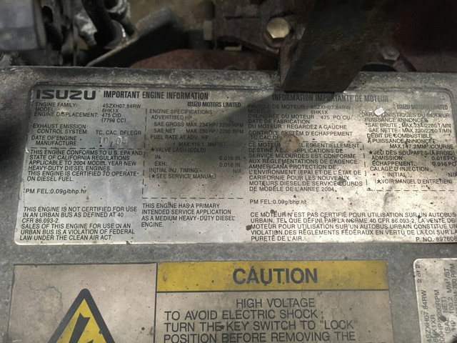 GOOD USED ISUZU 6HK1X DIESEL TAKEOUT ENGINE FOR SALE. ALL COMPLETE AND RUN TESTED. 6 CYLINDER, TURBOCHARGED, ELECTRONIC, WITH TC, CAC, DFI, & EGR EMISSIONS CONTROL SYSTEMS. 35-80 LBS OIL PRESSURE. 30 DAY GUARANTEE ON THE BLOCK AND THE CRANK. NO CORE EXCHANGE NEEDED!