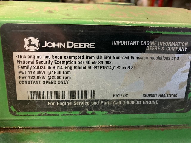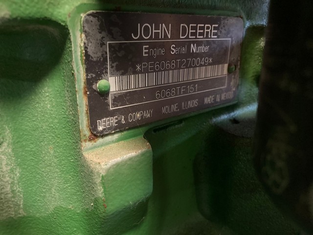 GOOD USED JOHN DEERE 6068T POWER TECH TAKEOUT ENGINE FOR SALE. ALL COMPLETE (MINUS ALTERNATOR) AND RUN TESTED, MILITARY SURPLUS. 6 CYLINDER, TURBOCHARGED, CONSTANT SPEED GOV. 55 LBS OIL PRESSURE. 30 DAY GUARANTEE ON THE BLOCK AND THE CRANK. NO CORE EXCHANGE NEEDED!