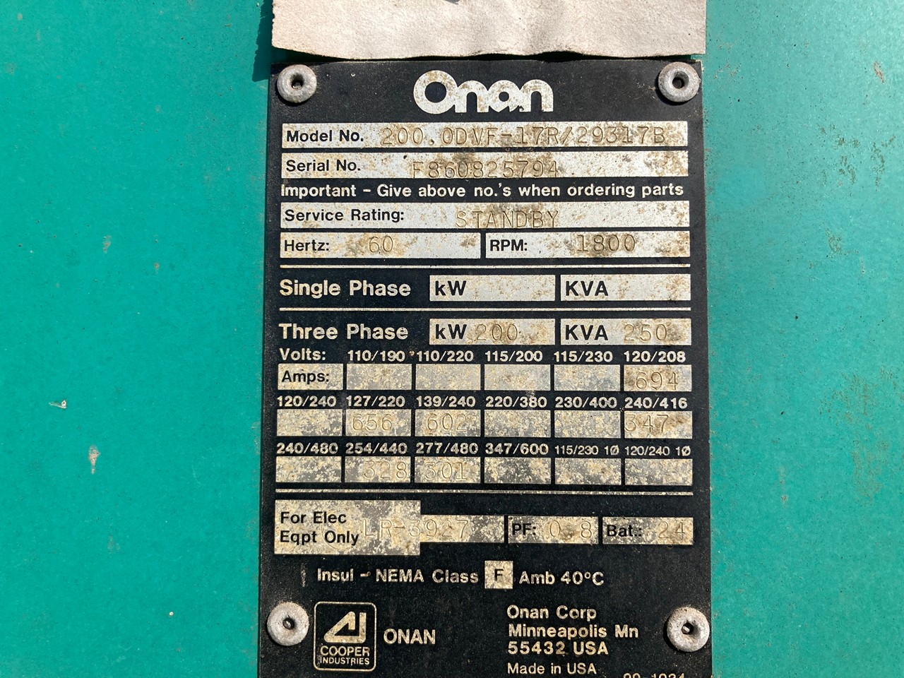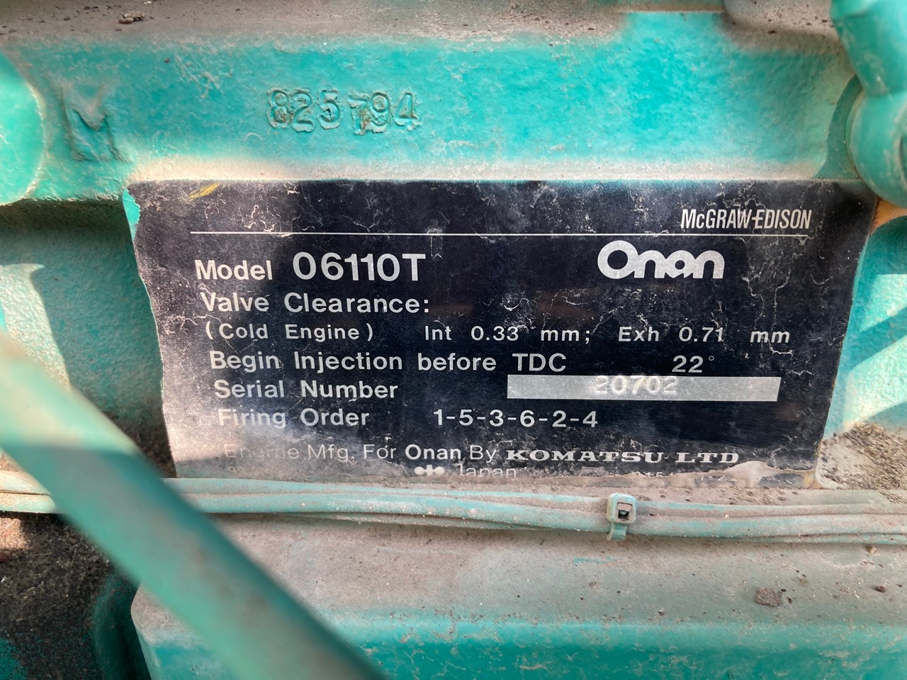 LOW HOUR, ONAN KOMATSU 06110T 200KW DIESEL GENERATOR SET FOR SALE at ADELMAN’S TRUCK PARTS in CANTON, OHIO. ONLY 391 HOURS SHOWING ON METER, 3 PHASE, 200 KW, 250 KVA, 277/480 VOLTS, 301 AMPS, 60 HZ, 1800 RPM, STANDBY UNIT, with 100 LBS OIL PRESSURE.