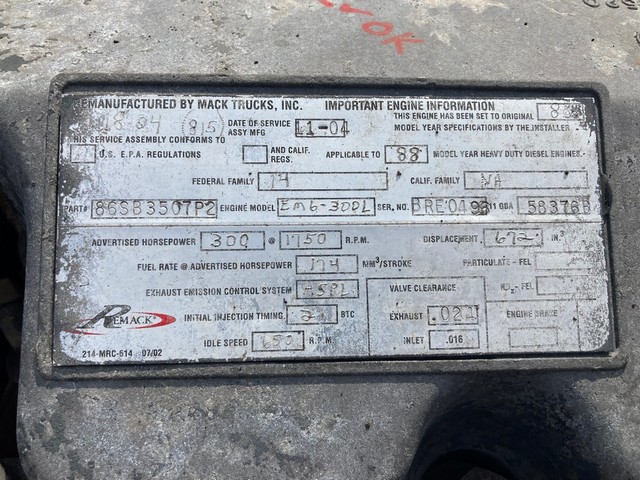 | Engine Serial NO. | BRE0496 (MACK REMAN SERIAL #) |