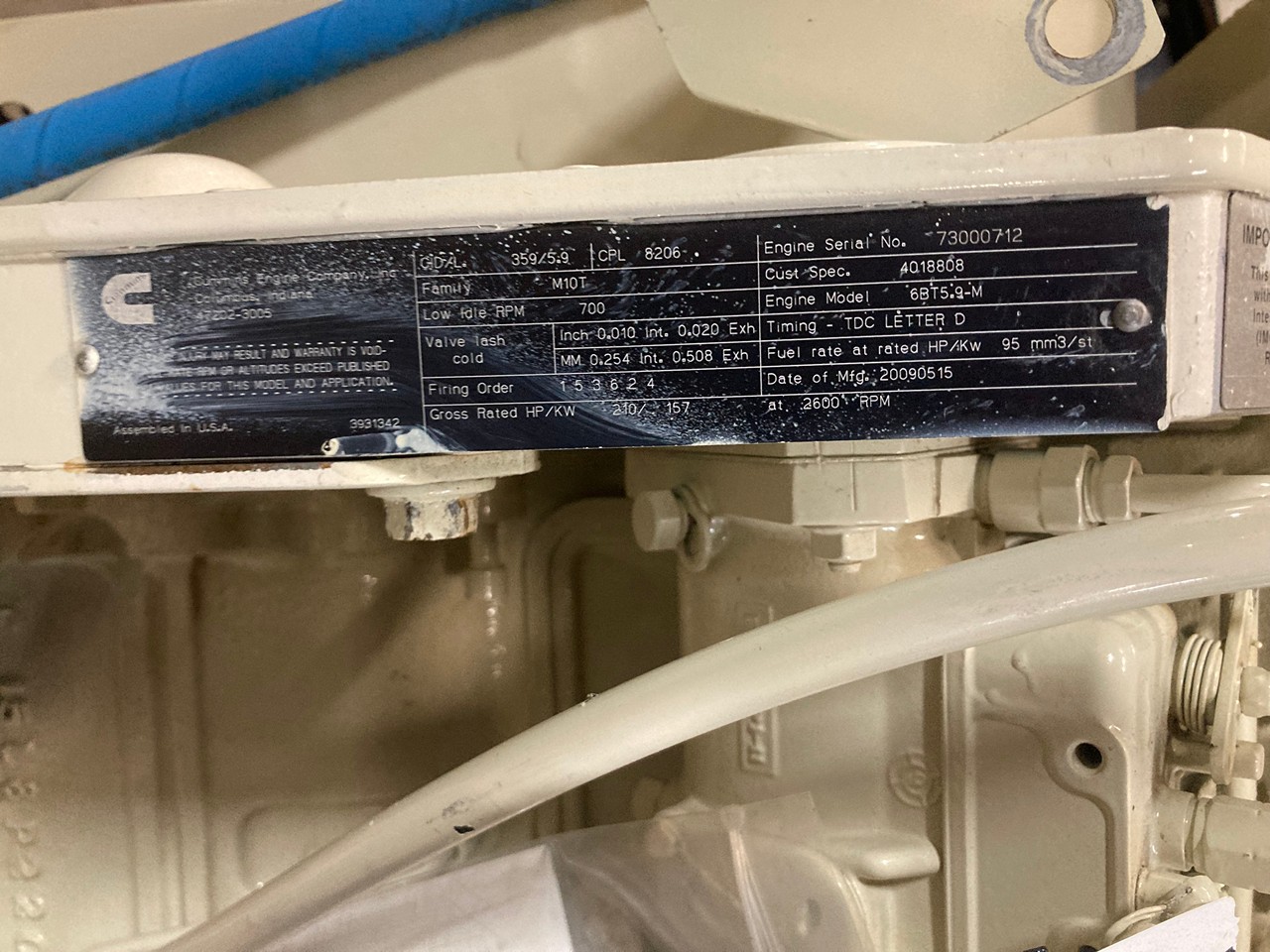 NEW 2009 CUMMINS MERCRUISER 6BT5.9 210HP MARINE DIESEL ENGINE FOR SALE in CANTON, OHIO at ADELMAN’S TRUCK PARTS. ALL COMPLETE with STARTER, ALTERNATOR, and FLYWHEEL, CPL # 8206, 210 HP @ 2600 RPM, 6 CYLINDER, and TURBOCHARGED.