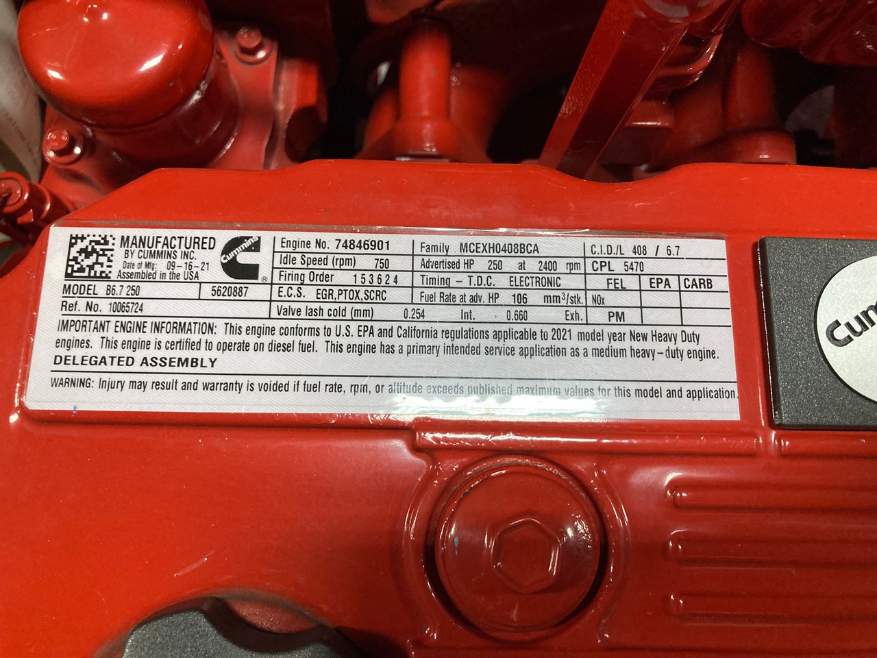 NEW 2021 CUMMINS ISB6.7 250HP DIESEL ENGINE FOR SALE at ADELMAN’S TRUCK PARTS in CANTON, OHIO. COMPLETE (MINUS FLYWHEEL, STARTER & ALTERNATOR), 6 CYLINDER, ELECTRONIC w/ECM, B6.7 250, CM2450 with COMMON RAIL FUEL SYSTEM, CPL 5470, 250 HP @ 2400 RPM, MCEXH0408BCA FAMILY #, with EGR, PTOX, & SCRC EMISSIONS CONTROL SYSTEMS.