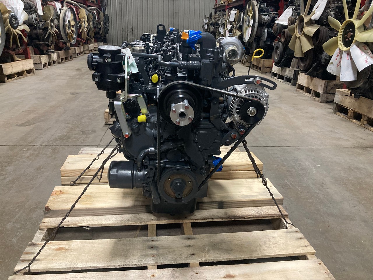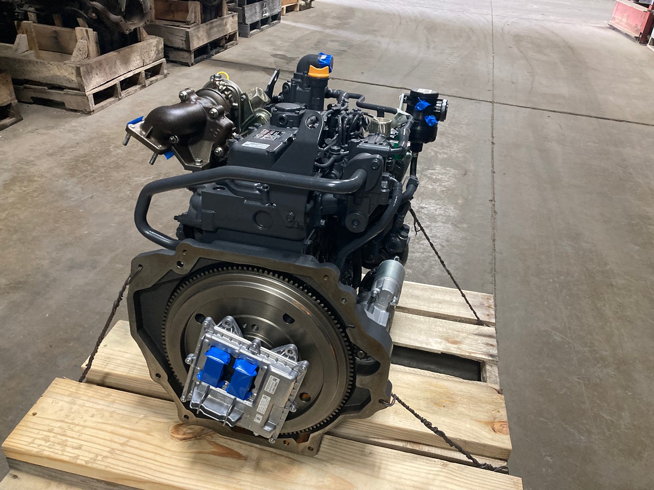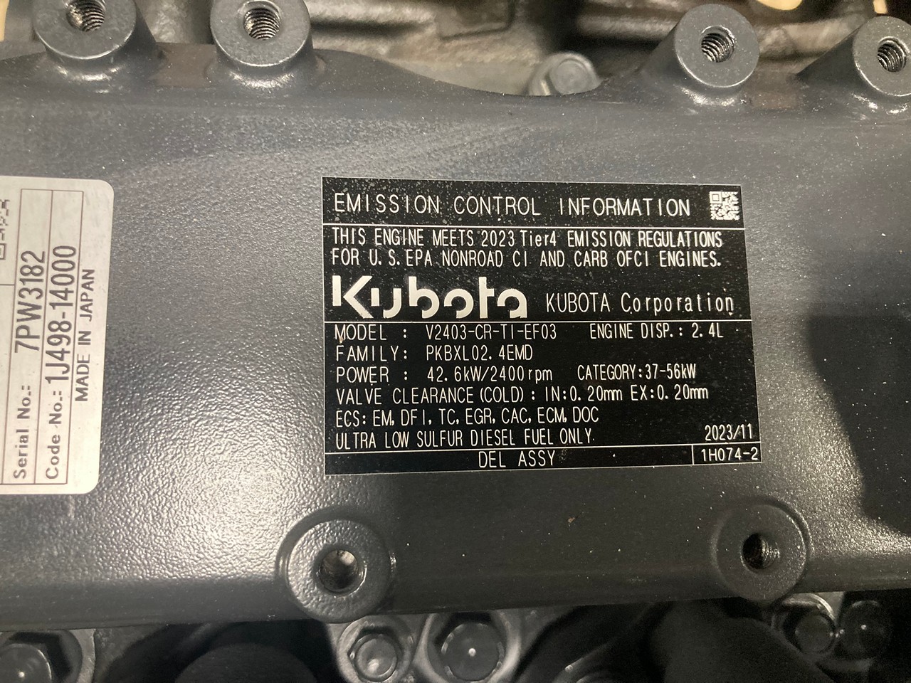 NEW 2023 KUBOTA V2403-CR-TI-EF03 DIESEL ENGINE FOR SALE at AEDLMAN’S TRUCK PARTS in CANTON, OHIO.  ALL COMPLETE, with STARTER, ALTERNATOR, FLYWHEEL, and ECM, ELECTRONIC, 4 CYLINDER, TURBOCHARGED, 2.4 LITERS, 57 HP @ 2400 RPM’S, COMMON RAIL, TIER 4 FINAL EMISSIONS, PKBXL02.4EMD FAMILY #, with EM, DFI, TC, EGR, CAC, ECM, & DOC EMISSIONS CONTROL SYSTEMS.