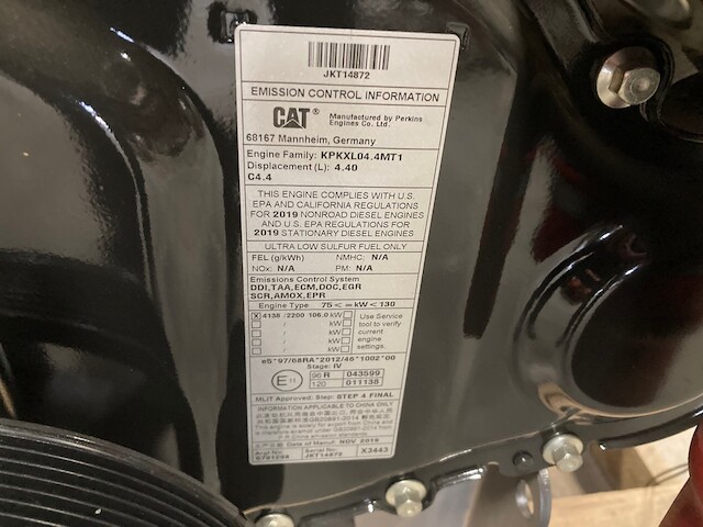 NEW 2019 CATERPILLAR C4.4 ACERT ELECTRONIC DIESEL ENGINE FOR SALE AT ADELMAN’S IN CANTON, OHIO. All COMPLETE WITH STARTER, ALTERNATOR, TURBOCHARGER, ECM, FLYWHEEL, AND CLEAN EMISSIONS MODULE. 142 HP @ 2200 RPM, 579-1298 ARRANGEMENT #, COMMON RAIL FUEL SYSTEM. TIER 4 FINAL, KPKXL04.4MT1 FAMILY #, DDI, TAA, ECM, DOC, EGR, SCR, AMOX, & EPR EMISSIONS CONTROL SYSTEMS.