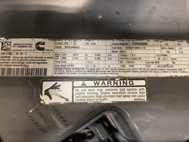NEW CUMMINS QSB4.5 LITER INDUSTRIAL POWER UNIT FOR SALE. RUN TESTED AND COMPLETE (NO CONTROL BOX) WITH RADIATOR, STARTER, ALTERNATOR, & ECM. 110 HP, TIER 3, DDI, ECM, TC, & CAC EMISSIONS CONTROL SYSTEMS. FAMILY # BCEXL0409AAG. CPL # 8754, 2012 YEAR MODEL. 70 LBS OIL PRESSURE.