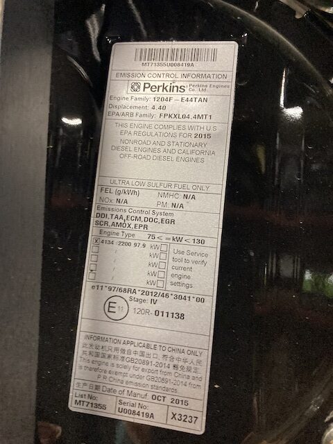 NEW PERKINS 1204F-E44TA ELECTRONIC DIESEL ENGINE FOR SALE AT ADELMAN’S, IN CANTON, OHIO. 4 CYLINDER, ELECTRONIC (ECM), TURBOCHARGED, 2015 YEAR MODEL, 131 HP @ 2200 RPM. BUILD LIST # MT71355. TIER 4 FINAL, FAMILY # FPKXL04.4MT1, EMISSIONS CONTROL SYSTEMS: DDI, TAA, ECM, DOC, EGR, SCR, AMOX, & EPR. NO CORE EXCHANGE NEEDED!
