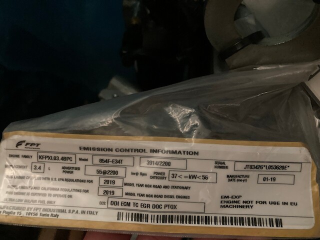 NEW 2019 PERKINS 854F-E34T ENGINE FOR SALE. ALL COMPLETE (MINUS WIRING HARNESS) WITH STARTER, ALT., ECM, AND PARTICULATE FILTER. 4 CYLINDER, ELECTRONIC, TURBOCHARGED WITH DDI, ECM, TC, EGR, DOC, & PTOX EMISSION CONTROL SYSTEMS. KFPXL03.4BPC FAMILY #. 74 HP @ 2200 RPM, TIER 4, BUILD LIST # JT83426.