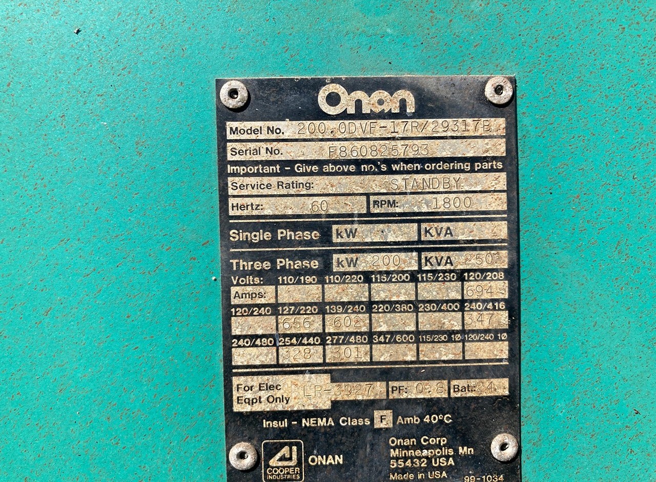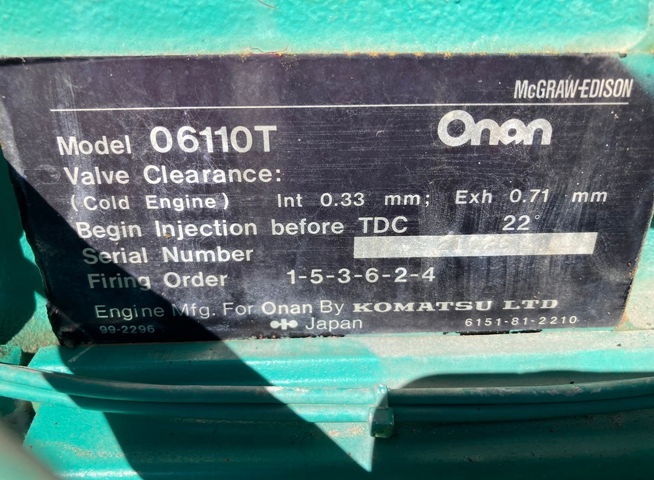 ONAN KOMATSU 06110T 200KW DIESEL GENERATOR SET FOR SALE at ADELMAN’S TRUCK PARTS in CANTON, OHIO. 917 HOURS SHOWING ON METER, 3 PHASE, 200 KW, 250 KVA, 277/480 VOLTS, 301 AMPS, 60 HZ, 1800 RPM, STANDBY UNIT, with 70 LBS OIL PRESSURE.