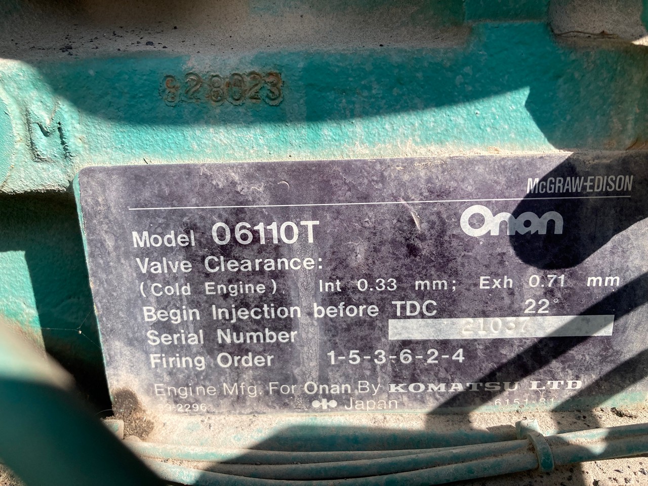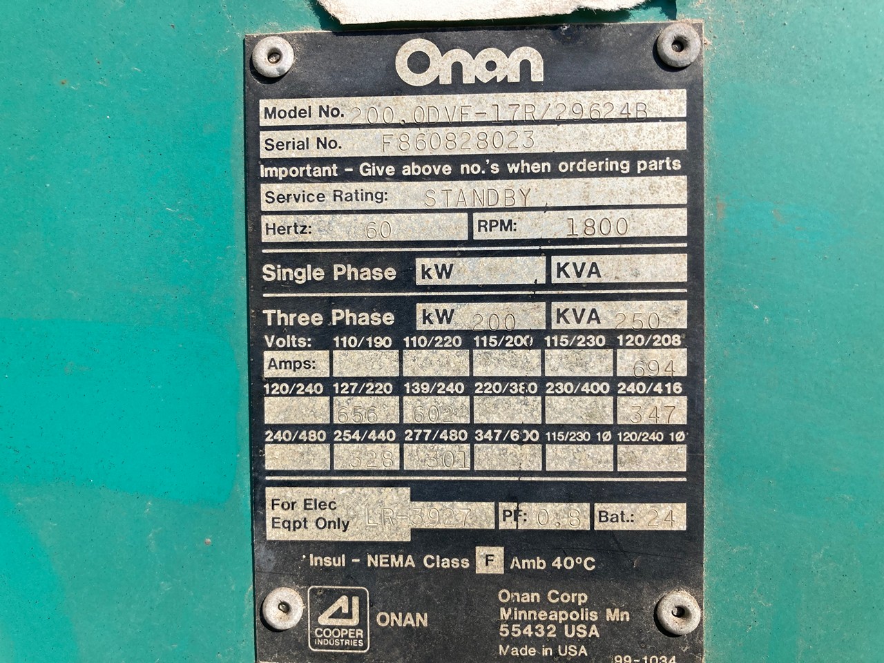 ONAN KOMATSU 06110T 200KW DIESEL GENERATOR SET FOR SALE at ADELMAN’S TRUCK PARTS in CANTON, OHIO. 1,209 HOURS SHOWING ON METER, 3 PHASE, 200 KW, 250 KVA, 277/480 VOLTS, 301 AMPS, 60 HZ, 1800 RPM, STANDBY UNIT, with 90 LBS OIL PRESSURE.
