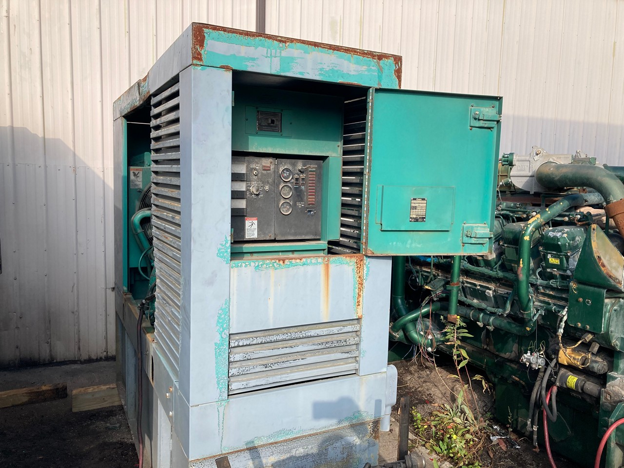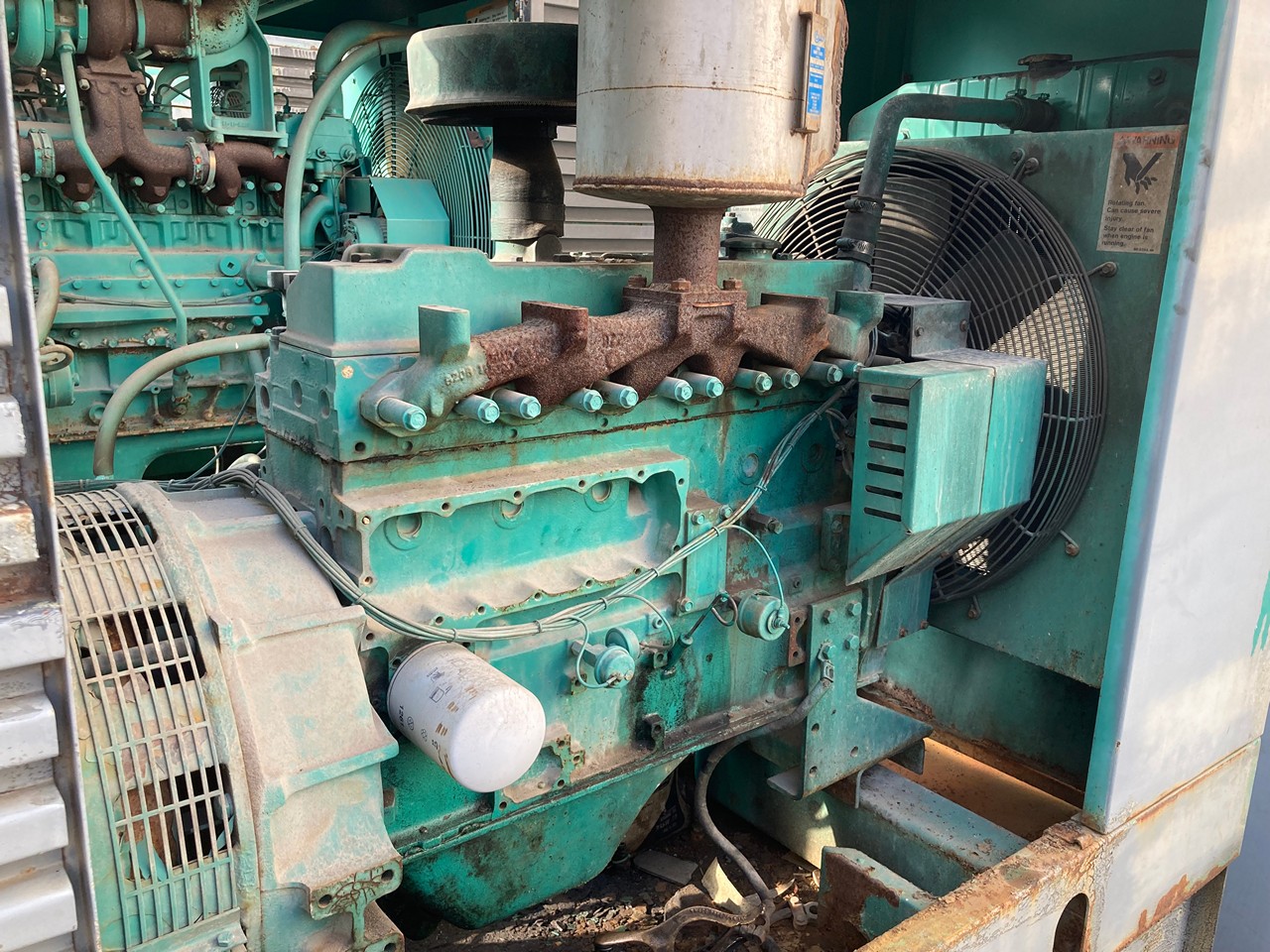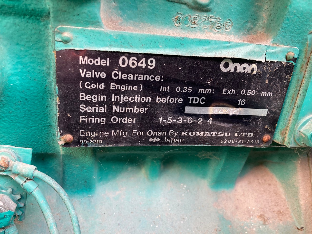 ONAN KOMATSU 0649 50KW DIESEL GENERATOR SET FOR SALE at ADELMAN’S TRUCK PARTS in CANTON, OHIO. 1,056 HOURS SHOWING ON METER, SINGLE or 3 PHASE CAPABLE, 50 KW, 62.5 KVA (3 PHASE), 33 KW, 41 KVA (SINGLE PHASE), 277/480 VOLTS, 75 AMPS, 60 HZ, 1800 RPM, STANDBY UNIT, with 100 LBS OIL PRESSURE.