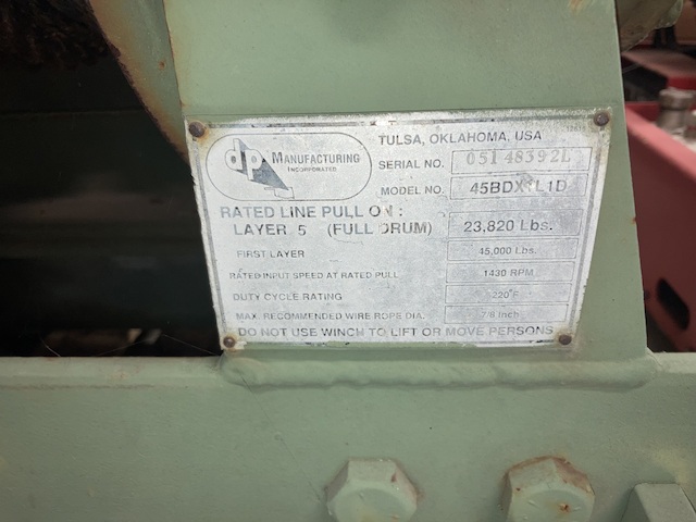 GOOD USED 45,000 LB. DP HYDRAULIC WINCH FOR SALE. TRACTOR MOUNT WITH 2 SPEED CONTROLS (SLOW AND FAST) AND LINE IN AND LINE OUT CONTROLS. HANDLES 7/8 IN. x 150 FT. WINCH LINE. LINE SPEED IS 14 FPM (SLOW) AND 26 FPM (FAST). COMES WITH WINCH LINE AND 42 GALLON HYDRAULIC TANK.